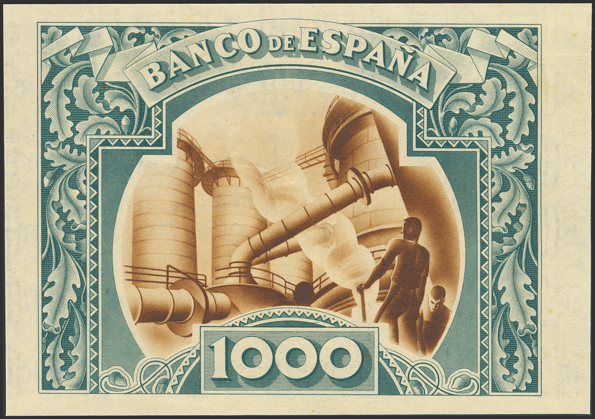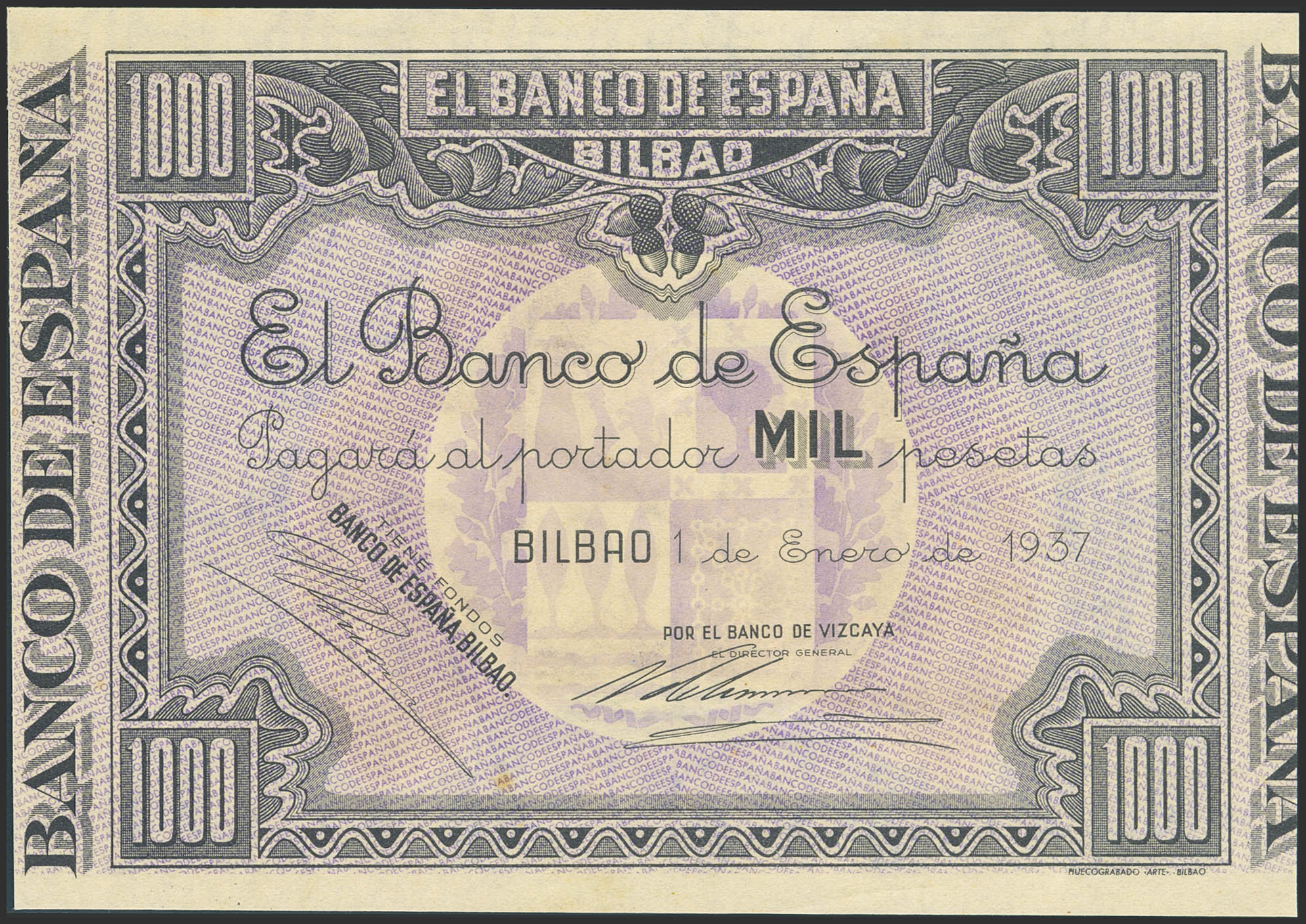 1000 Pesetas. 1 de Enero de 1937. Sucursal de Bilbao, antefirma Banco de Vizcaya. No emitido, sin serie y sin numeración, sin matrices. (Edifil 2023: NE27g). Apresto original. SC-.