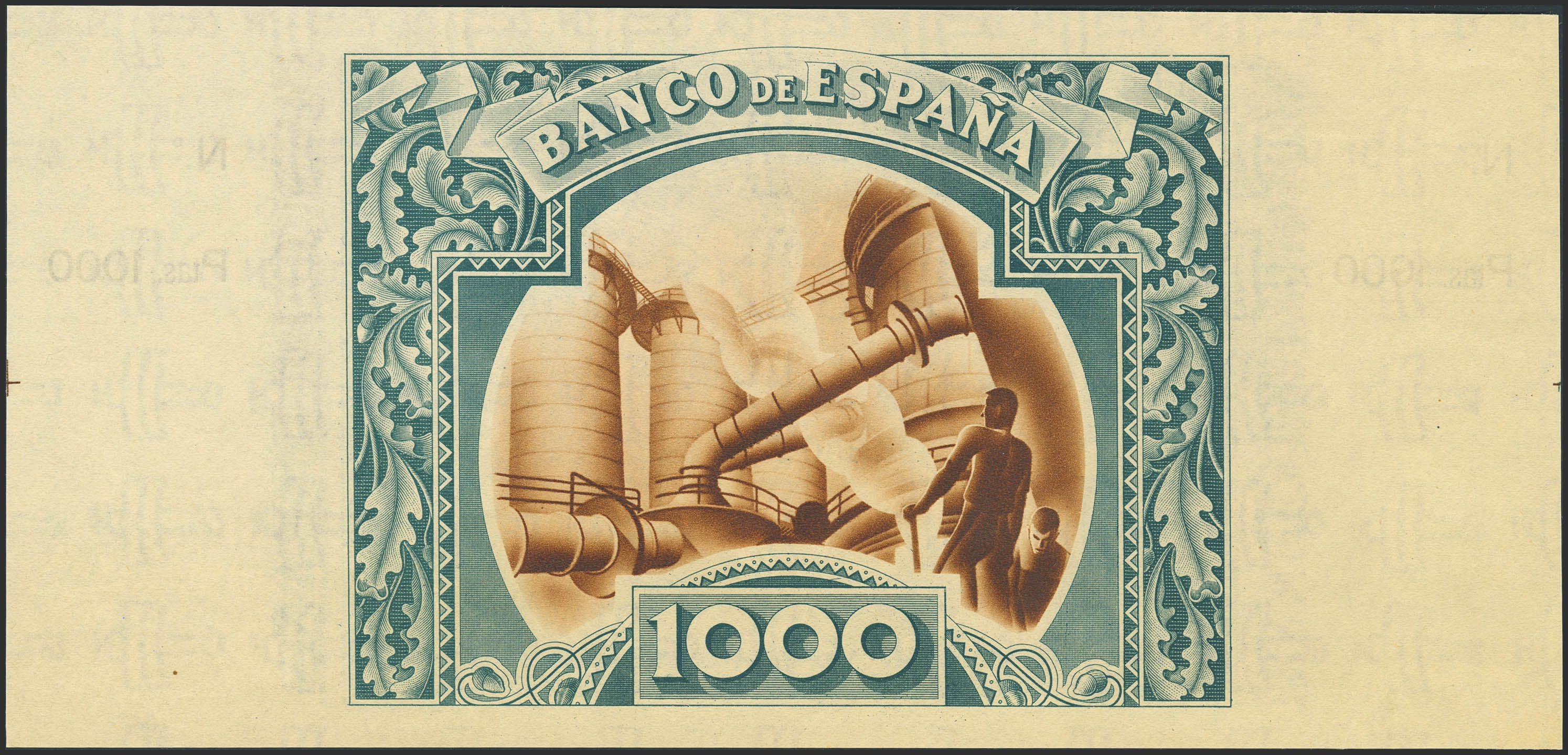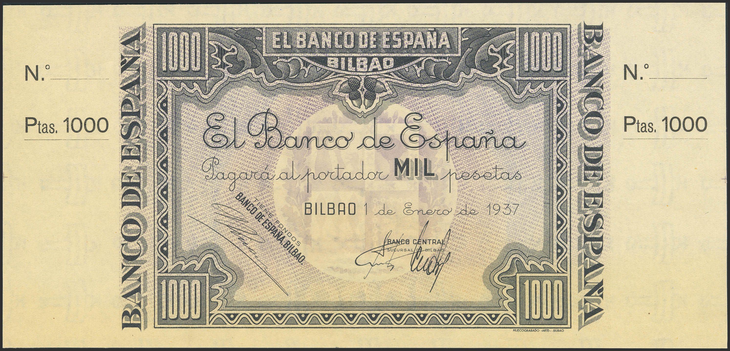 1000 Pesetas. 1 de Enero de 1937. Sucursal de Bilbao, antefirma Banco de Central. No emitido, sin serie y sin numeración, con ambas matrices. (Edifil 2023: NE27b). Apresto original. SC-.