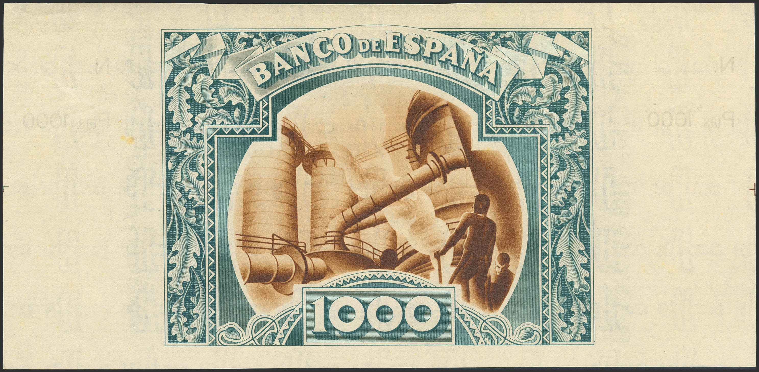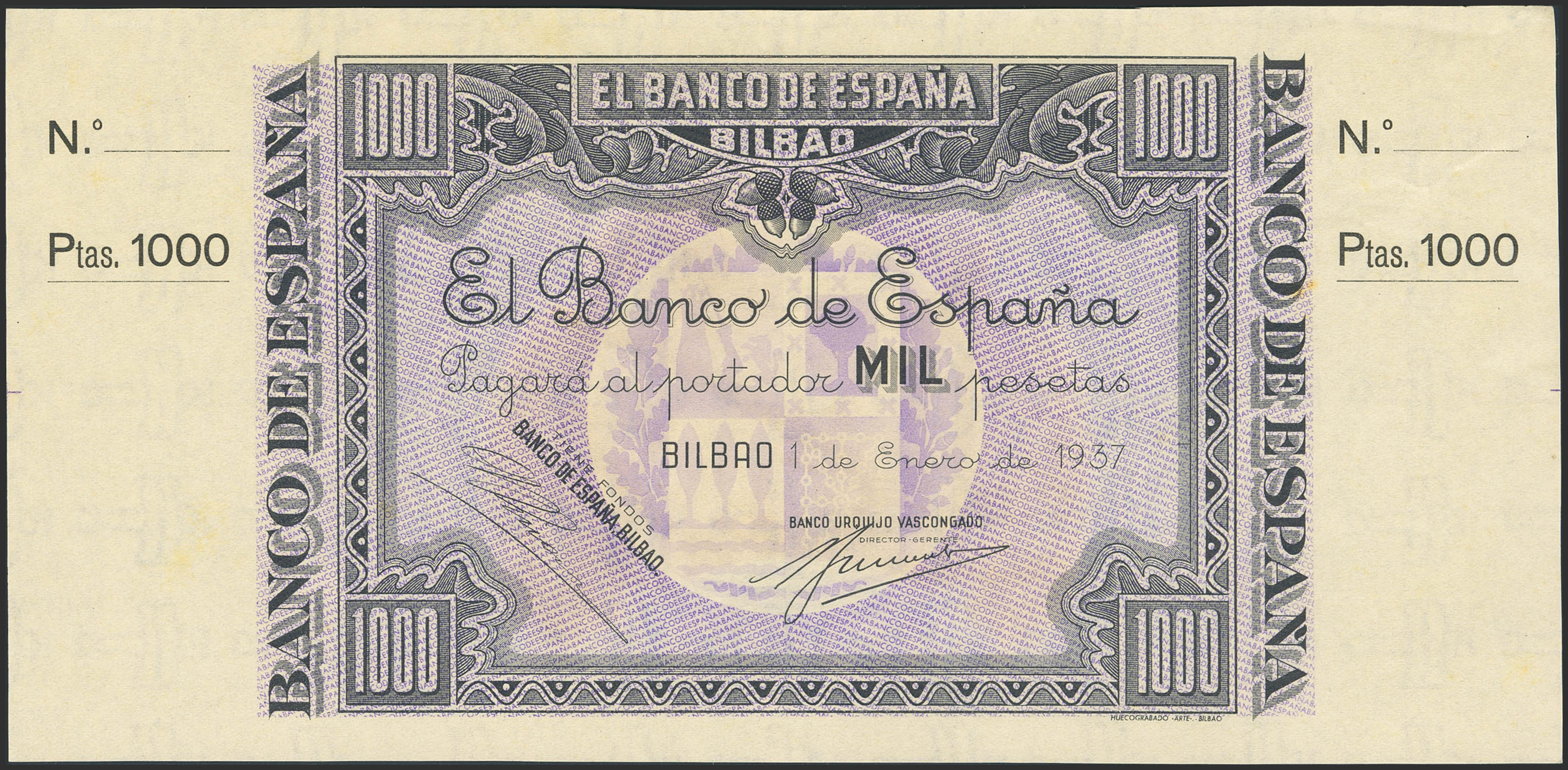 1000 Pesetas. 1 de Enero de 1937. Sucursal de Bilbao, antefirma Urquijo Vascongado. No emitido, sin serie y sin numeración, con ambas matrices. (Edifil 2023: NE27f). Apresto original, típicos puntitos del tiempo. SC-.