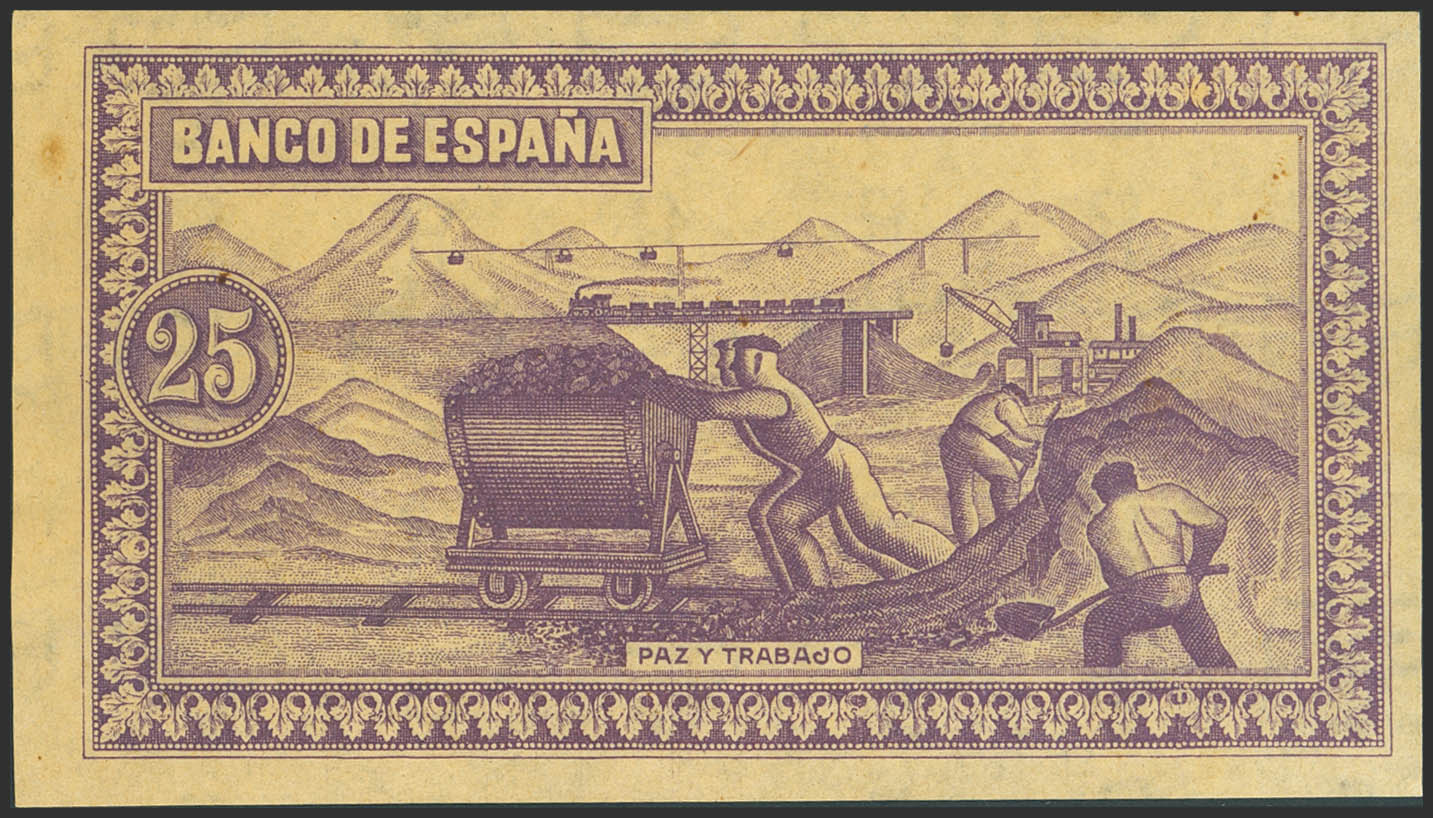 25 Pesetas. Septiembre 1937. No Emitido (de este valor sólo se conoce el reverso). Sucursal de Gijón. (Edifil 2023: NE29P). Inusual, puntitos del tiempo habituales. SC-.