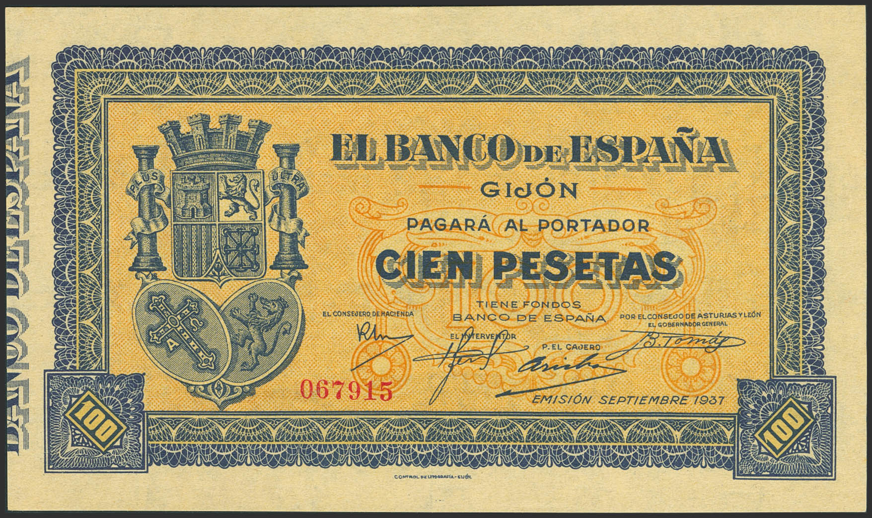 100 Pesetas. Septiembre 1937. Asturias y León. Sin serie. (Edifil 2023: 399). Conserva todo su apresto original. SC.