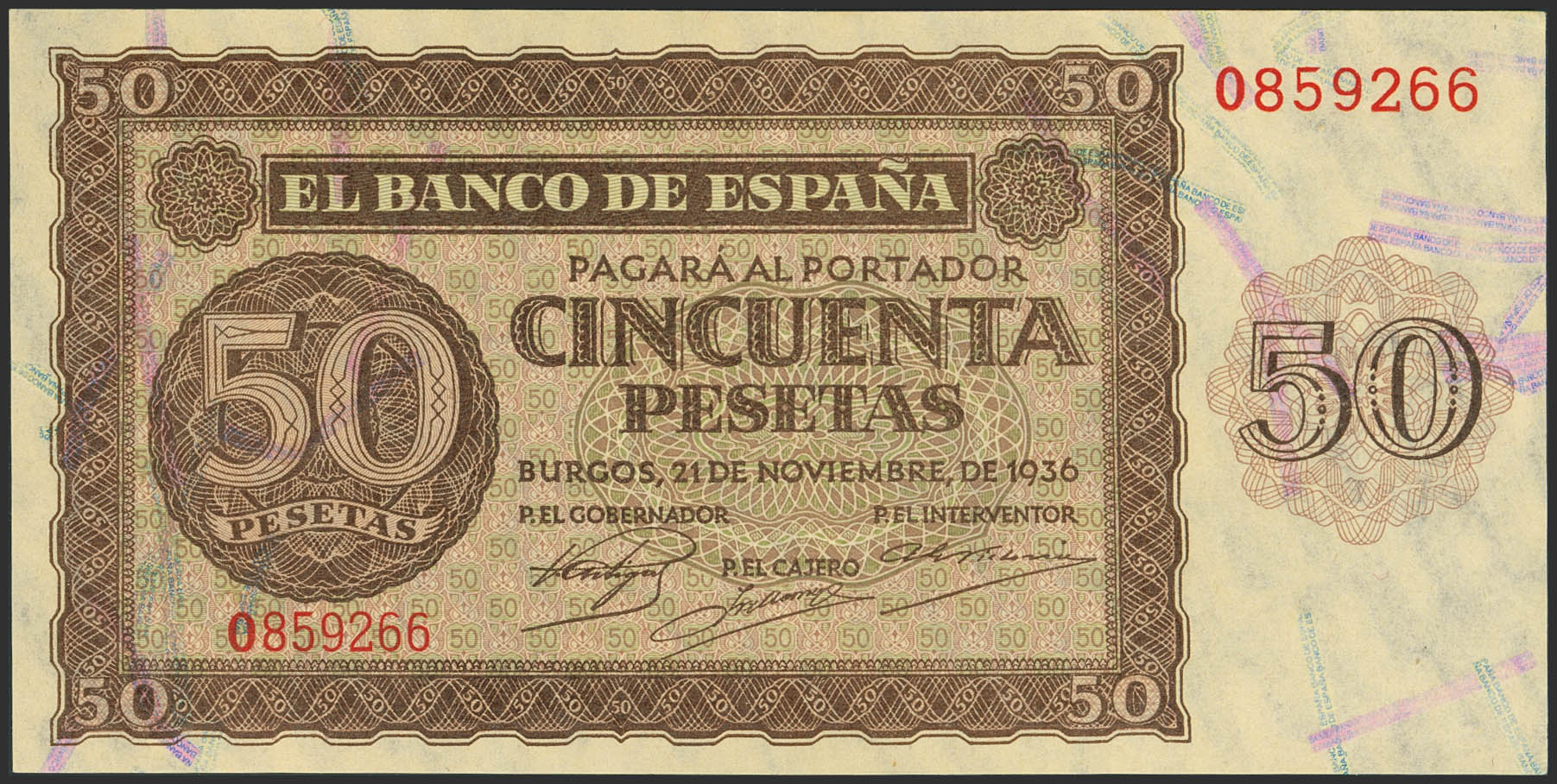 50 Pesetas. 21 de Noviembre de 1936. Serie O. (Edifil 2023: 420a). Apresto original. EBC+++.