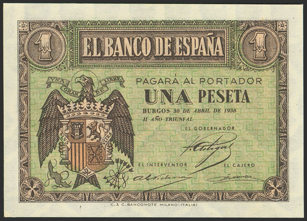 1 Peseta. 30 de Abril de 1938. Serie E. (Edifil 2023: 428a). Apresto original. SC.