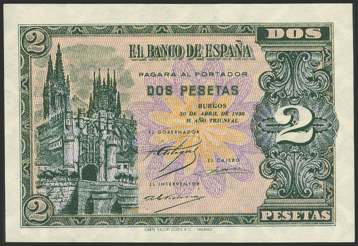 2 Pesetas. 30 de Abril de 1938. Serie A. (Edifil 2023: 429). Apresto original. SC.
