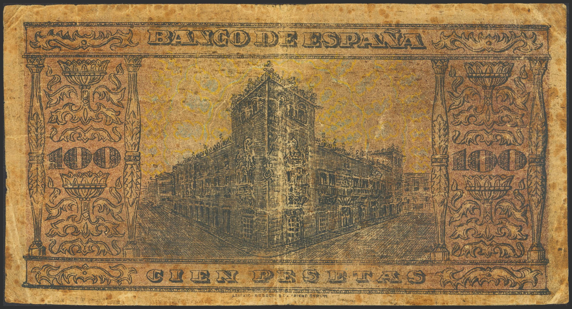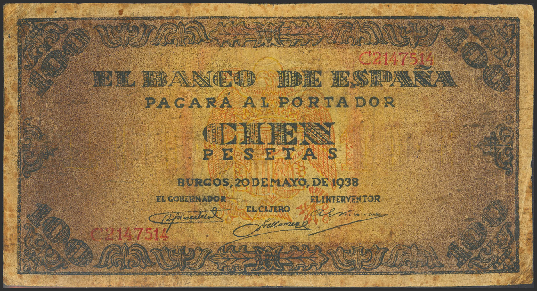 100 Pesetas. 20 de Mayo de 1938. Falso de época. Serie C. (Edifil 2023: 432F, Cobo: 41a). Muy raro. MBC+.