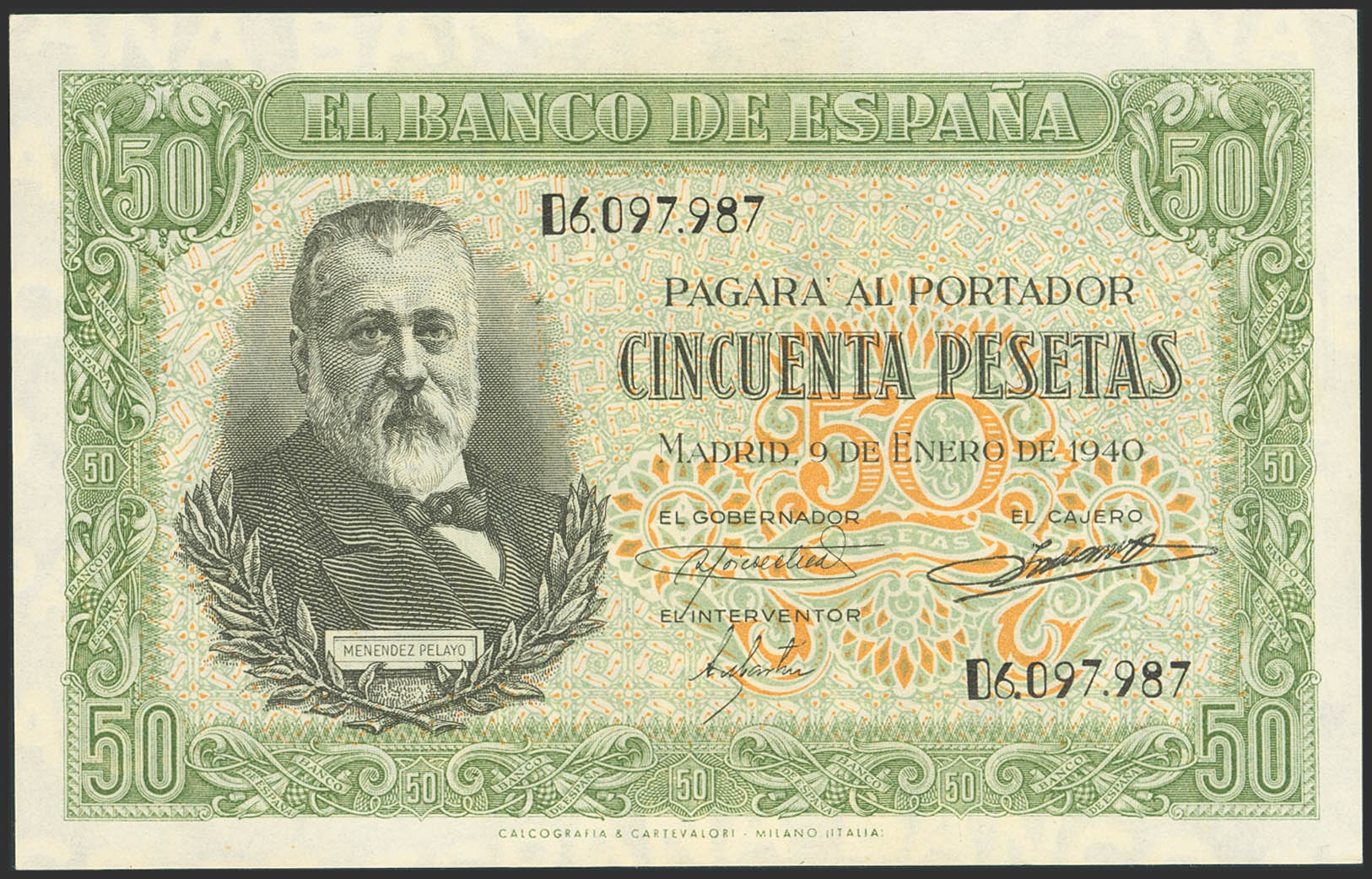 50 Pesetas. 9 de Enero de 1940. Serie D. (Edifil 2023: 437a). Apresto original. EBC+++.