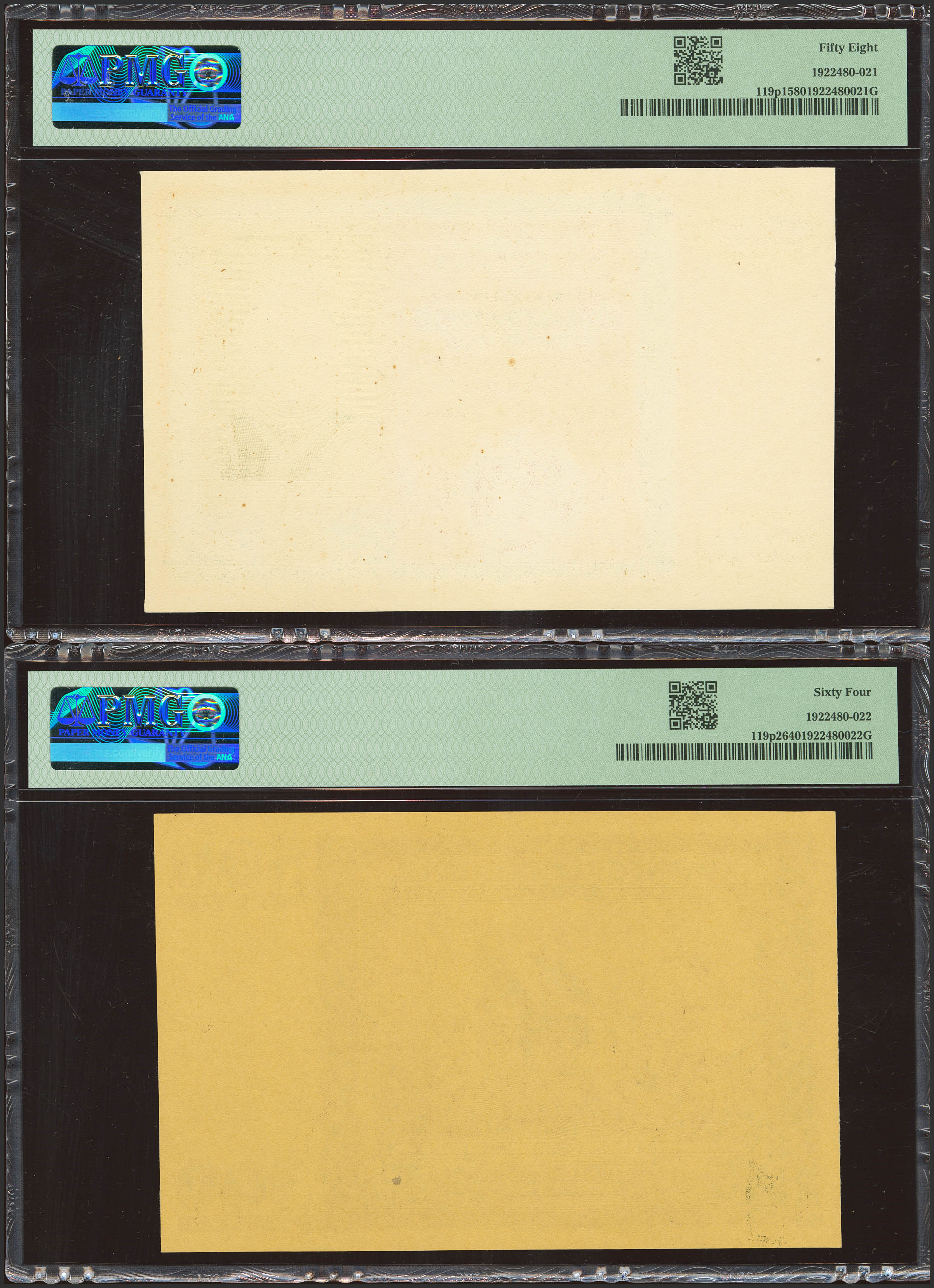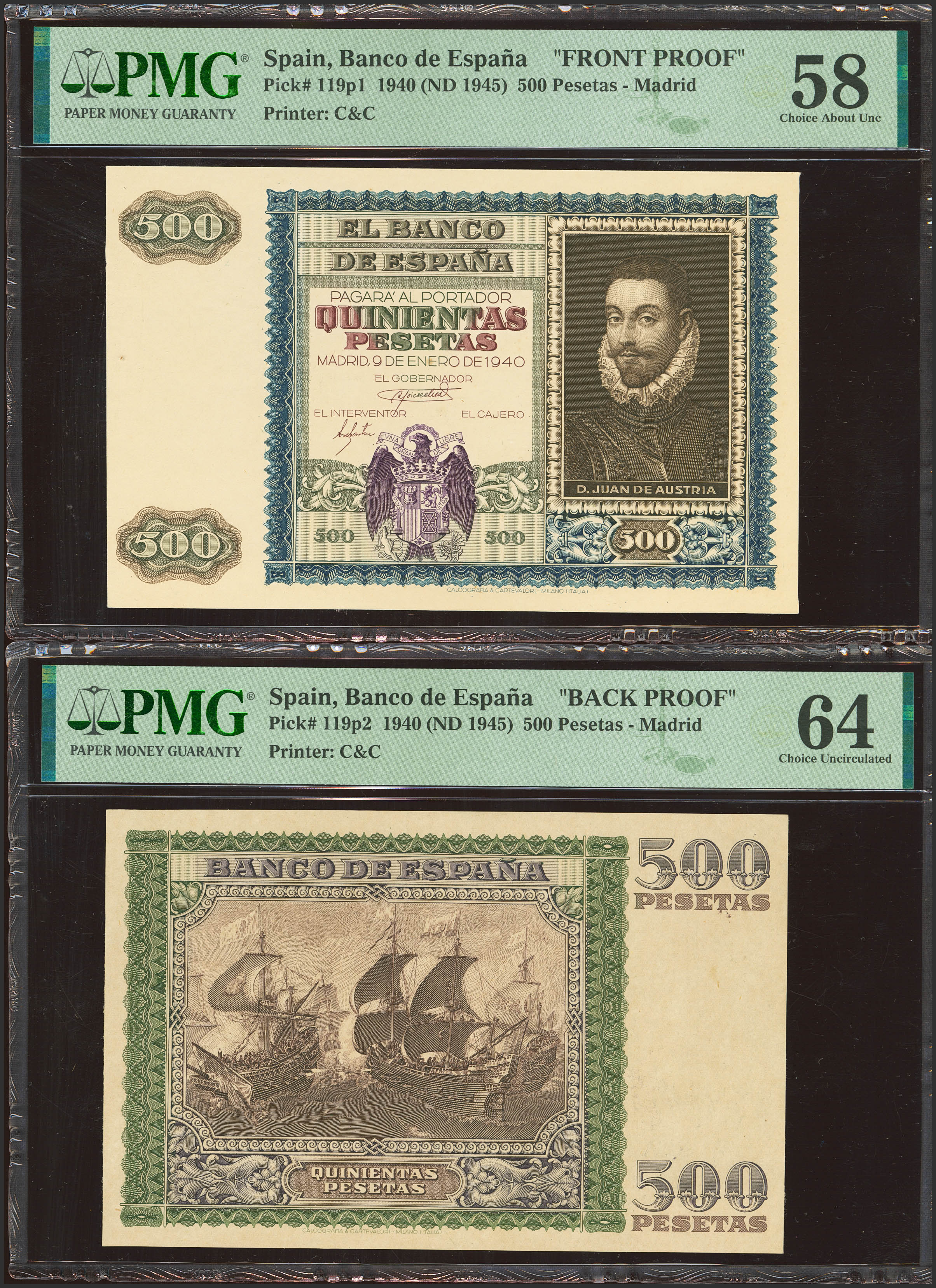 500 Pesetas. 9 de Enero de 1940. Prueba de anverso y reverso, sin numeración y sin firma del cajero. (Edifil 2023: 439Pa, 439Pb). Muy bonita y muy rara. EBC++/SC-. Encapsulado PMG55/65EPQ.