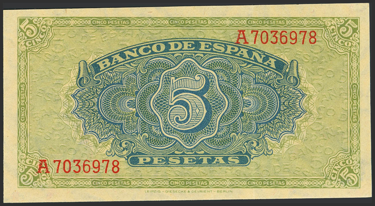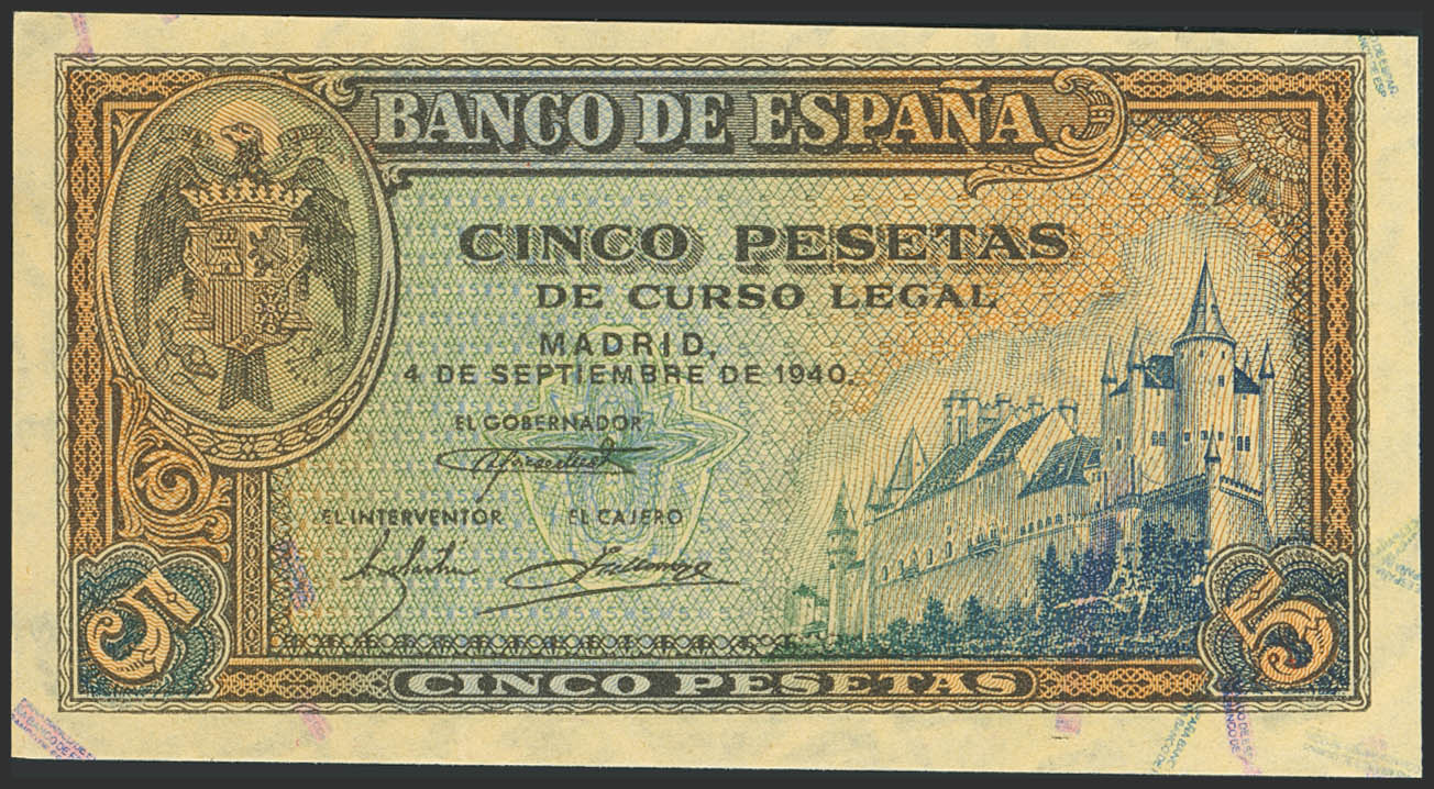5 Pesetas. 4 de Septiembre de 1940. Serie A. (Edifil 2023: 443). Conserva gran parte de su apresto original. EBC+.
