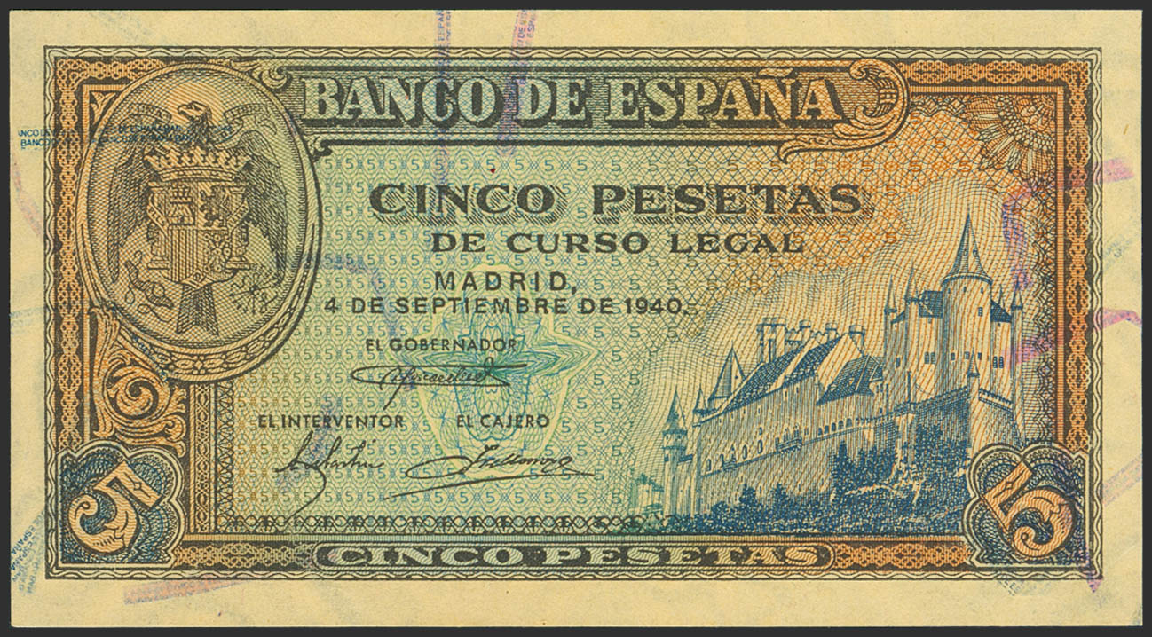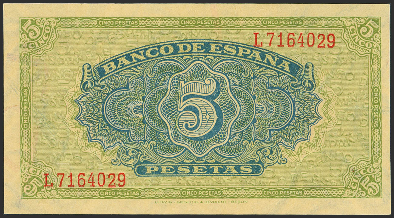 5 Pesetas. 4 de Septiembre de 1940. Serie L. (Edifil 2023: 443a). Conserva todo su apresto original. SC.