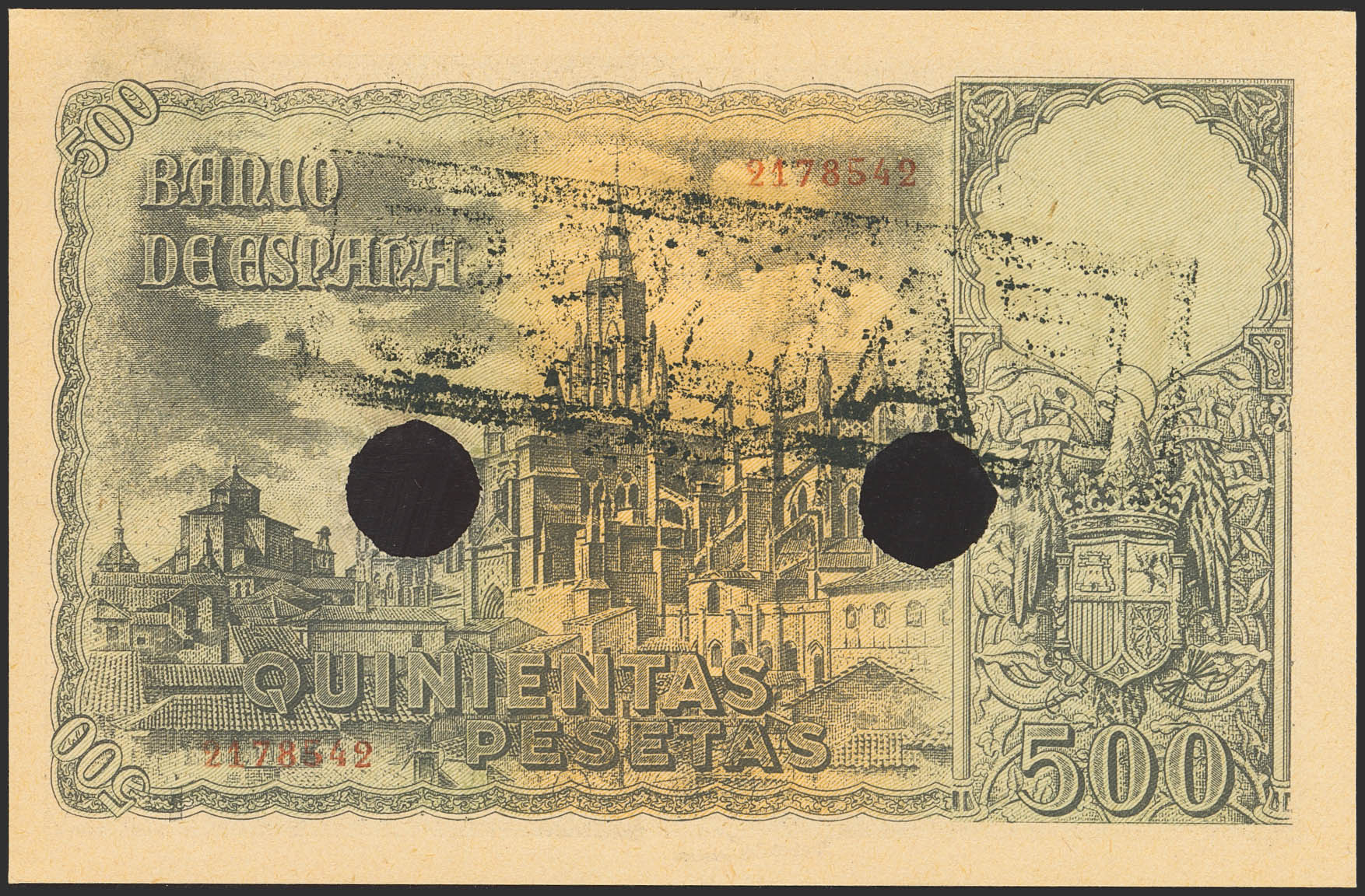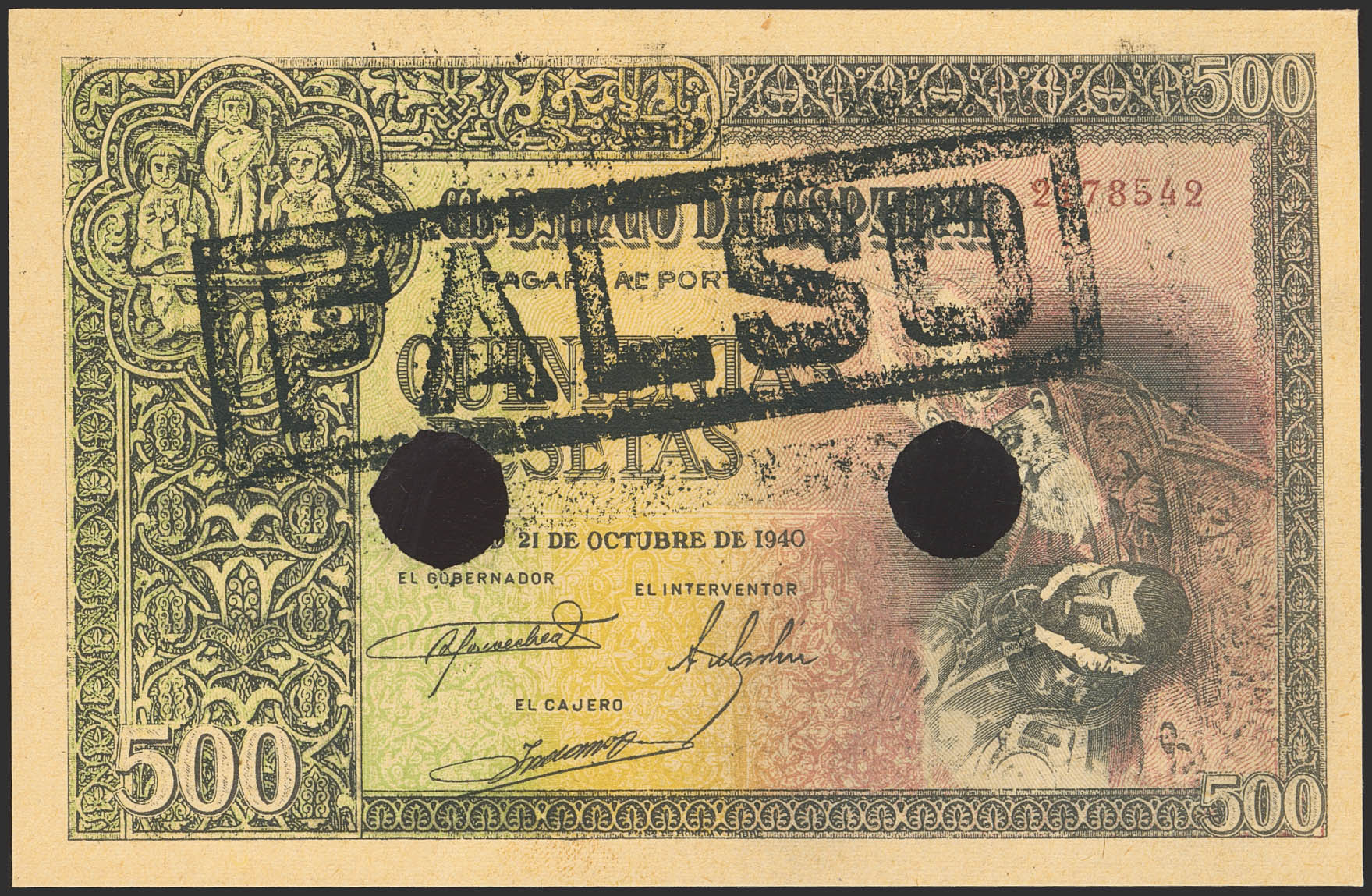 500 Pesetas. 21 de Octubre de 1940. Falso de época, con taladros y marca FALSO. Sin serie. (Edifil 2023: 444F, Cobo: 43). SC--.