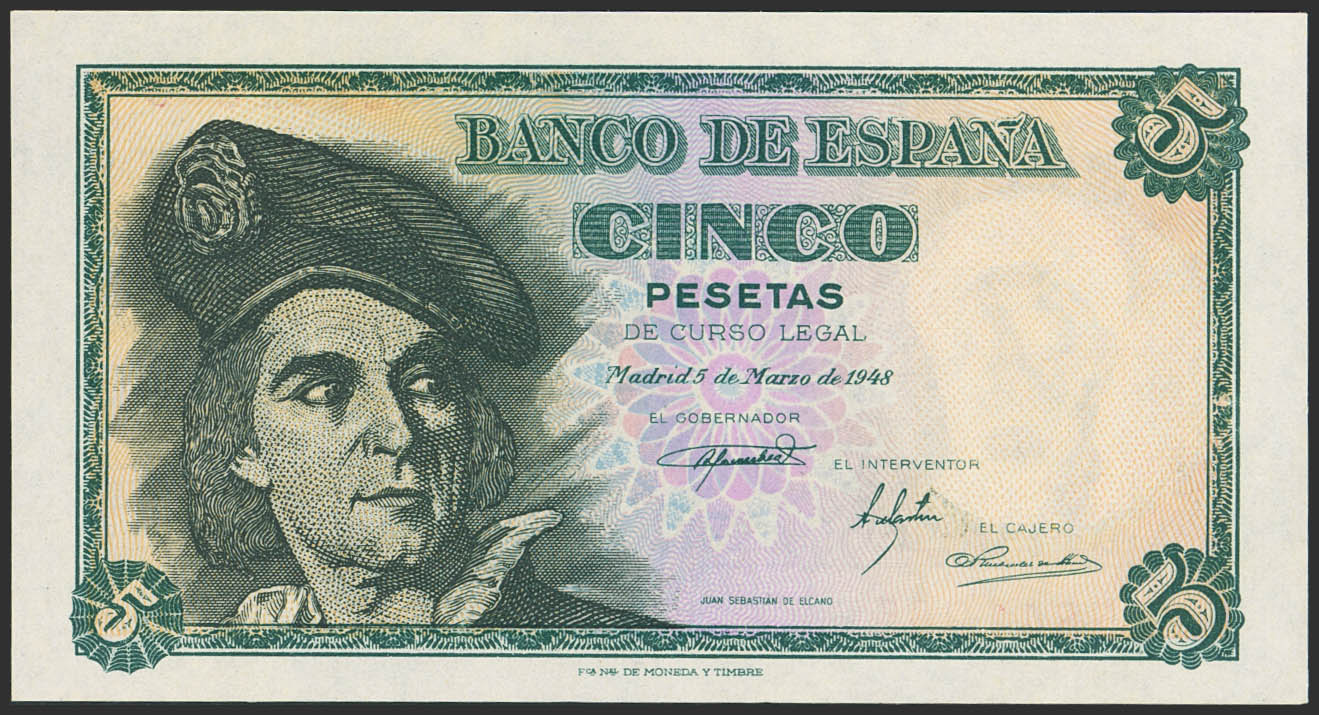 5 Pesetas. 5 de Marzo de 1948. Sin serie. (Edifil 2023: 455). Apresto original. SC-.