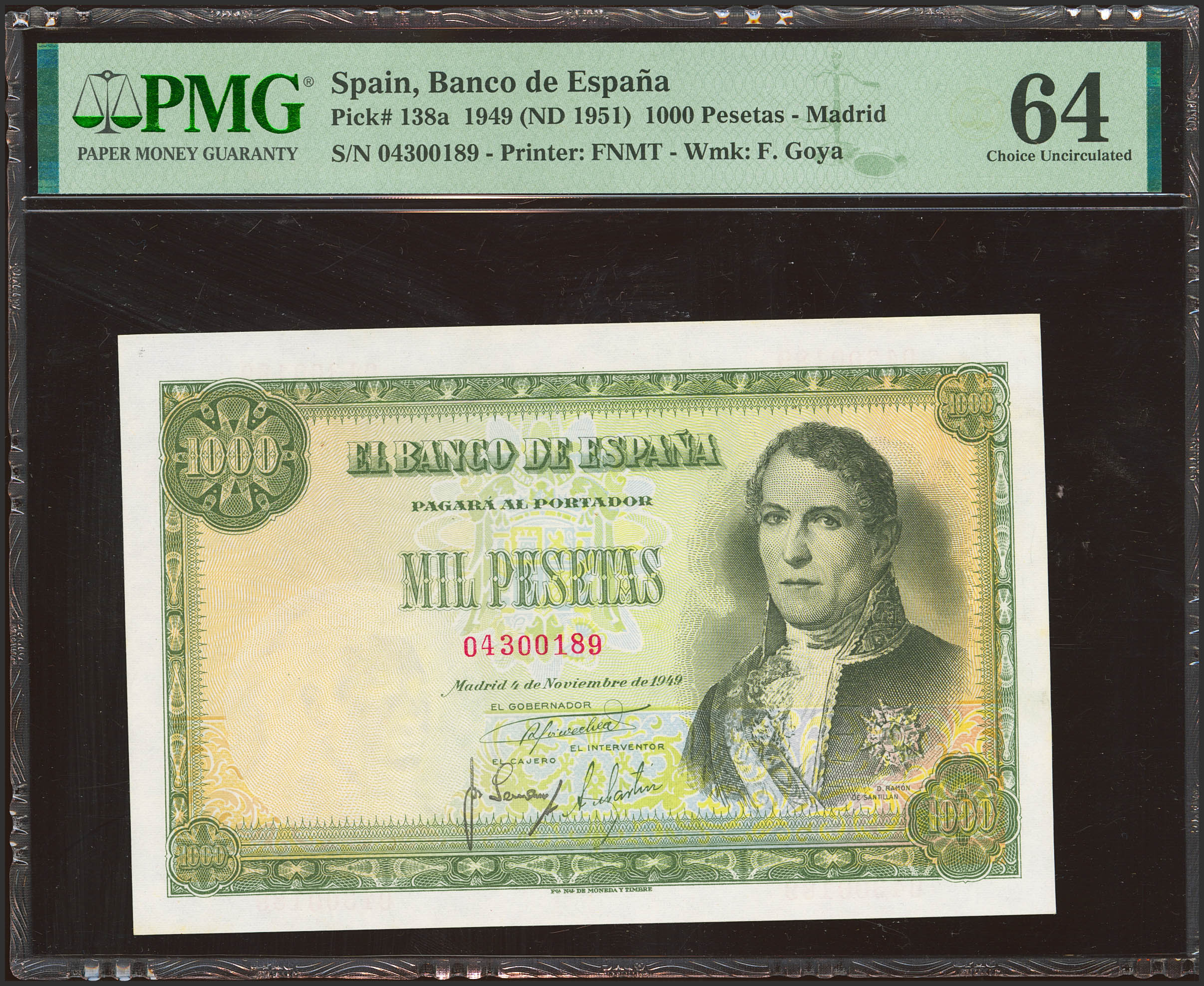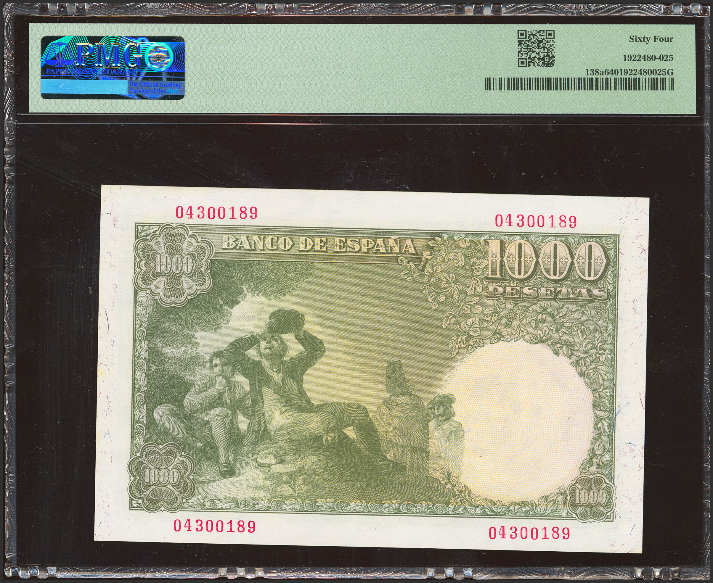 1000 Pesetas. 4 de Noviembre de 1949. Sin serie. (Edifil 2023: 458, Pick: 138a). Rarísimo en esta excepcional calidad. SC. Encapsulado PMG64.