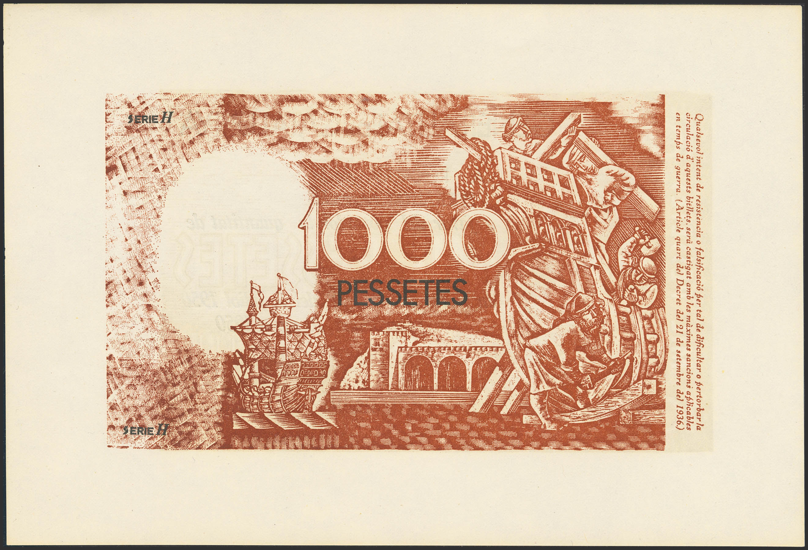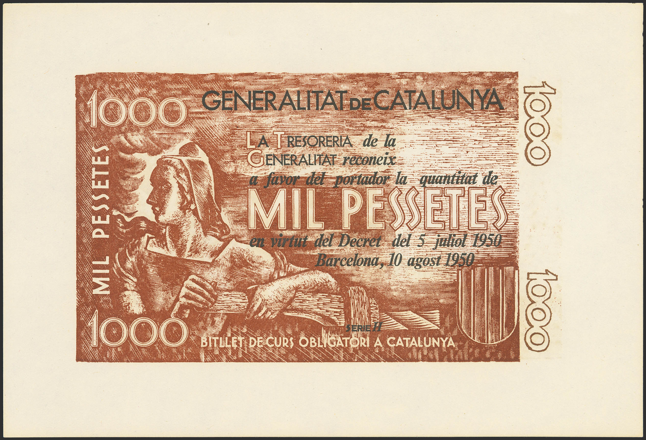 Prueba en color castaño de un billete No Emitido de la Generalitat de Catalunya de 1000 Pesetas, fechada el 10 de Agosto de 1950, con la serie H (billete emitido privadamente, sin respaldo legal). SC-.