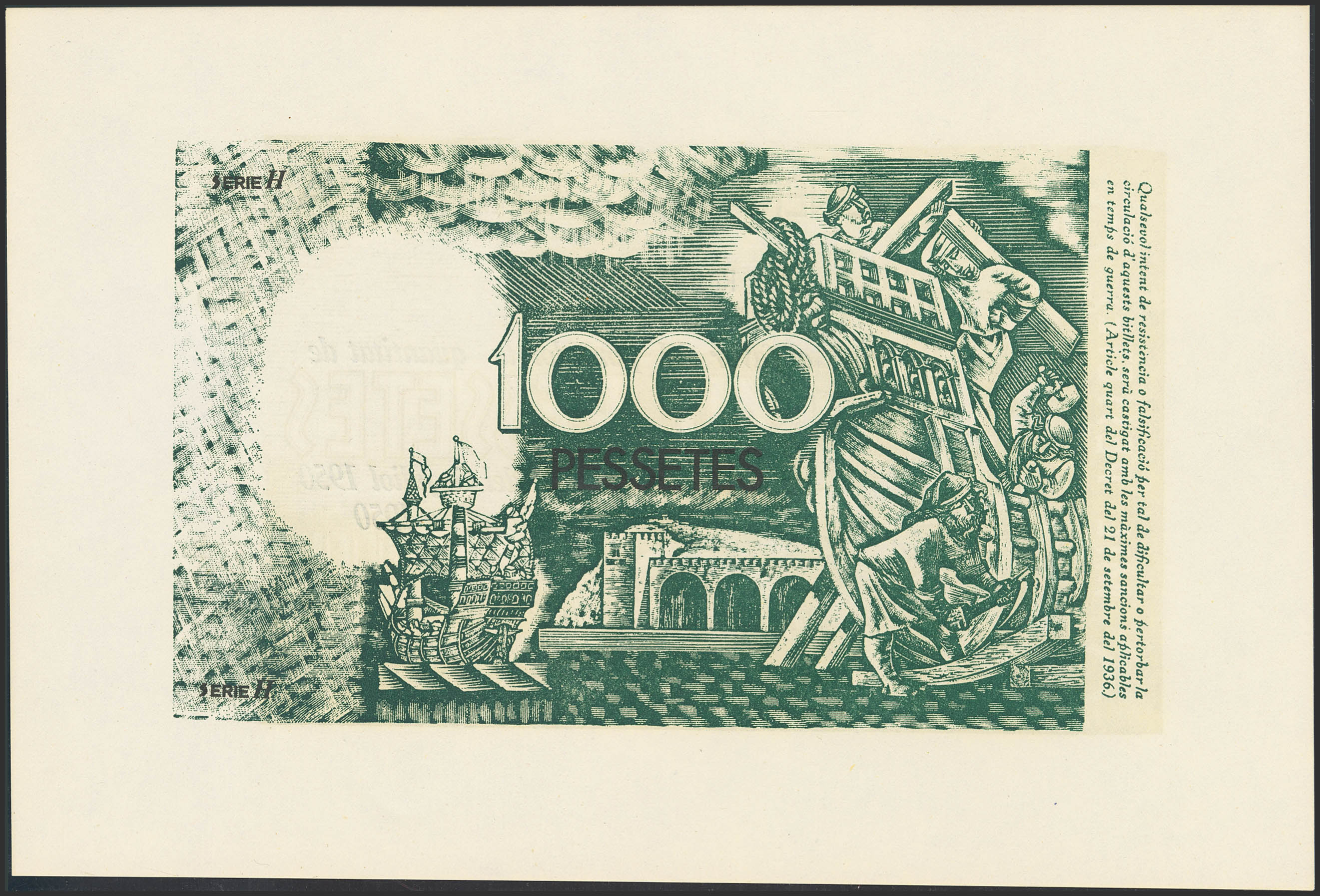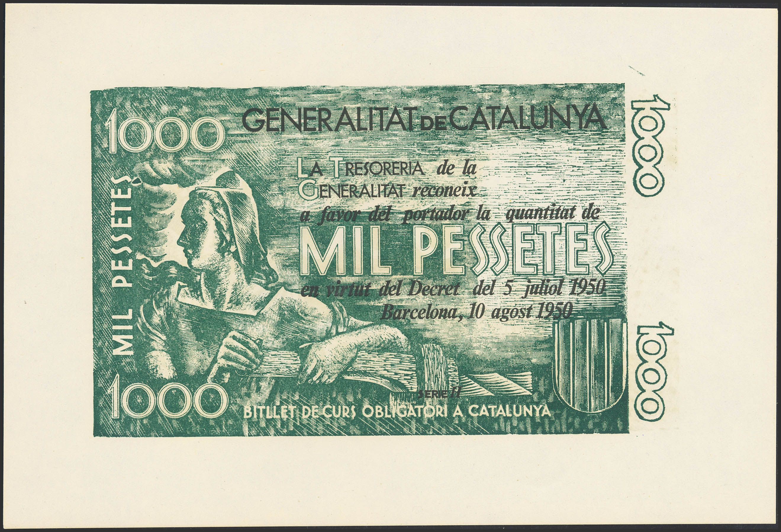 Prueba en color verde de un billete No Emitido de la Generalitat de Catalunya de 1000 Pesetas, emitido el 10 de Agosto de 1950, con la serie H (billete emitido privadamente, sin respaldo legal). SC-.
