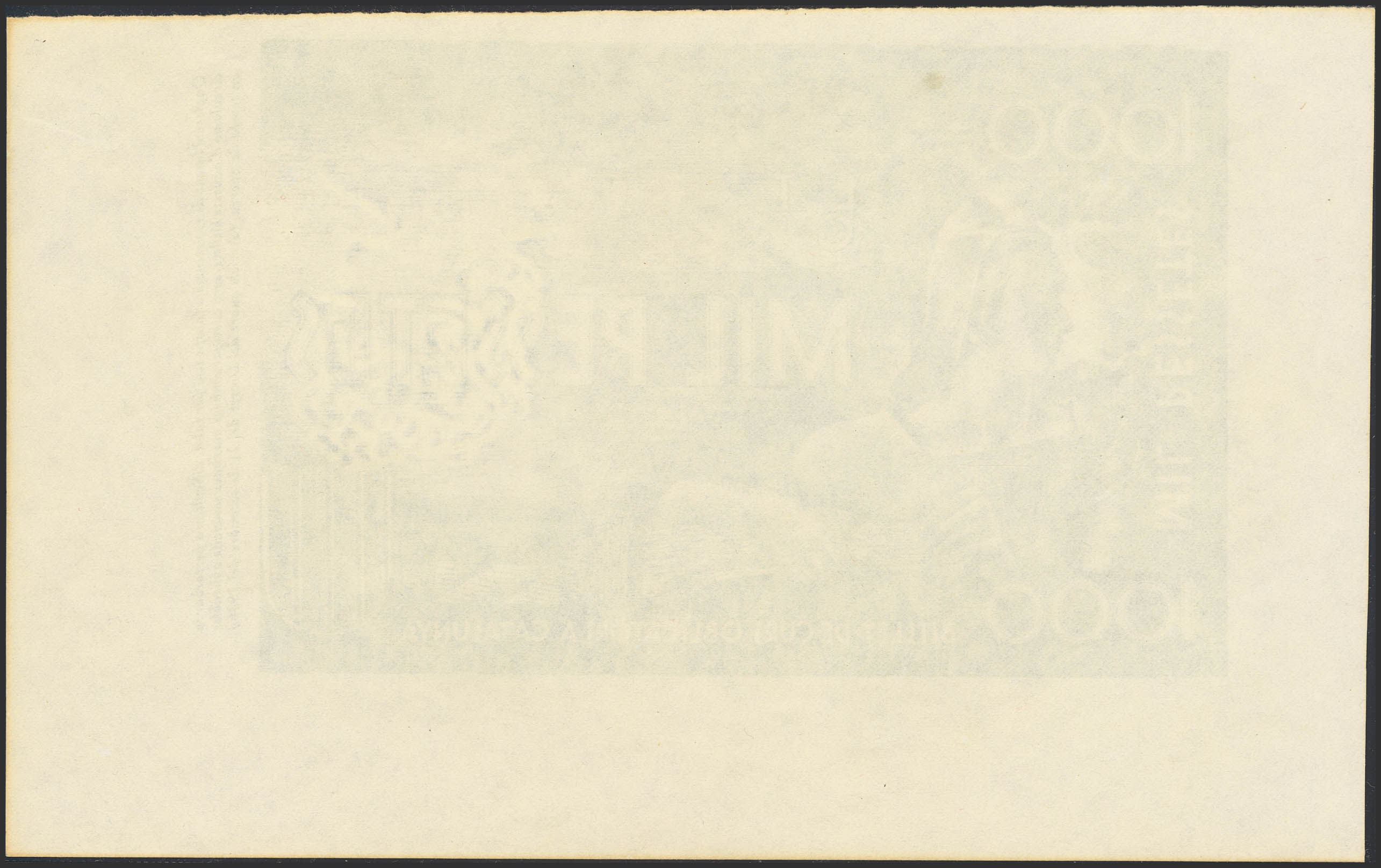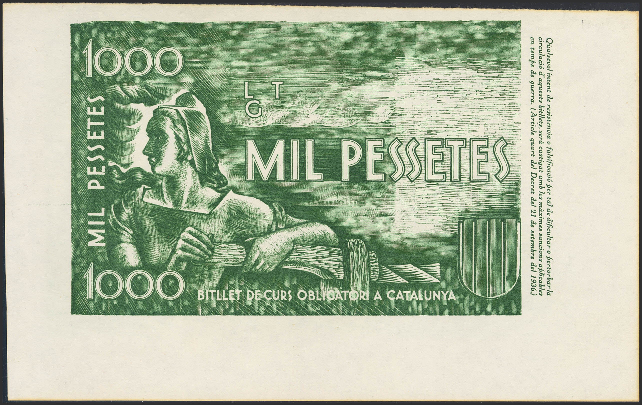 Prueba de anverso en color verde de un billete No Emitido de la Generalitat de Catalunya de 1000 Pesetas (billete emitido privadamente, sin respaldo legal). SC-.