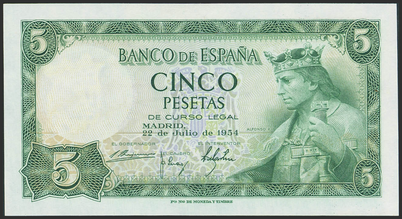 5 Pesetas. 22 de Julio de 1954. Sin serie. (Edifil 2023: 466). Conserva todo su apresto original. SC.