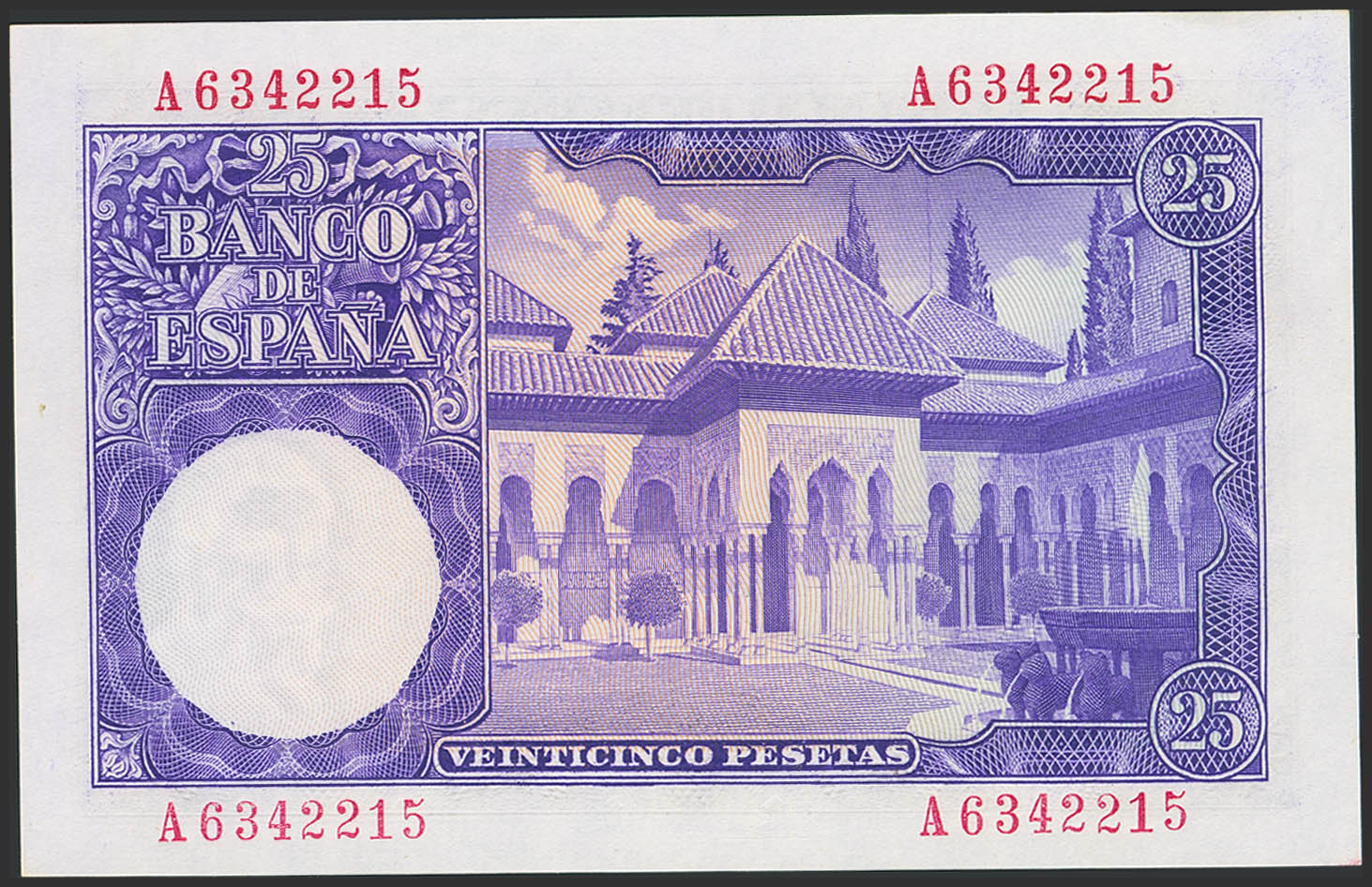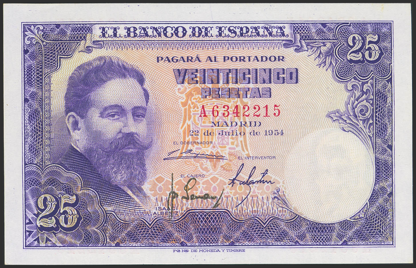 25 Pesetas. 22 de Julio de 1954. Serie A. (Edifil 2023: 467a). Apresto original. SC.