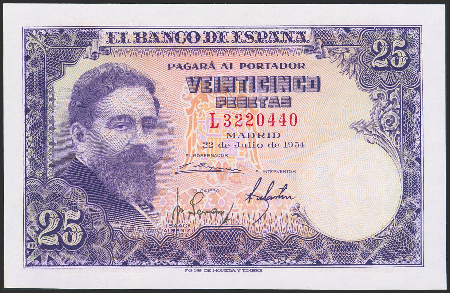 25 Pesetas. 22 de Julio de 1954. Serie L. (Edifil 2023: 467a). Apresto original. SC.