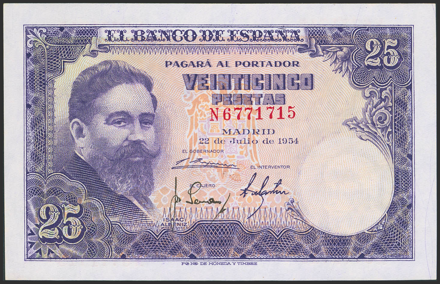 25 Pesetas. 22 de Julio de 1954. Serie N. (Edifil 2023: 467a). Apresto original. SC.