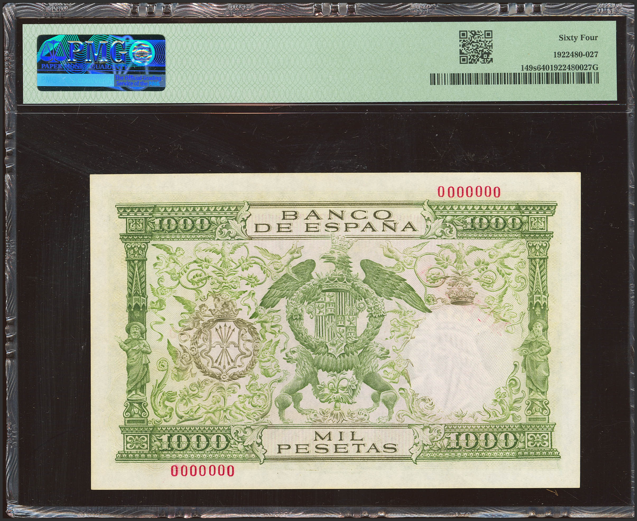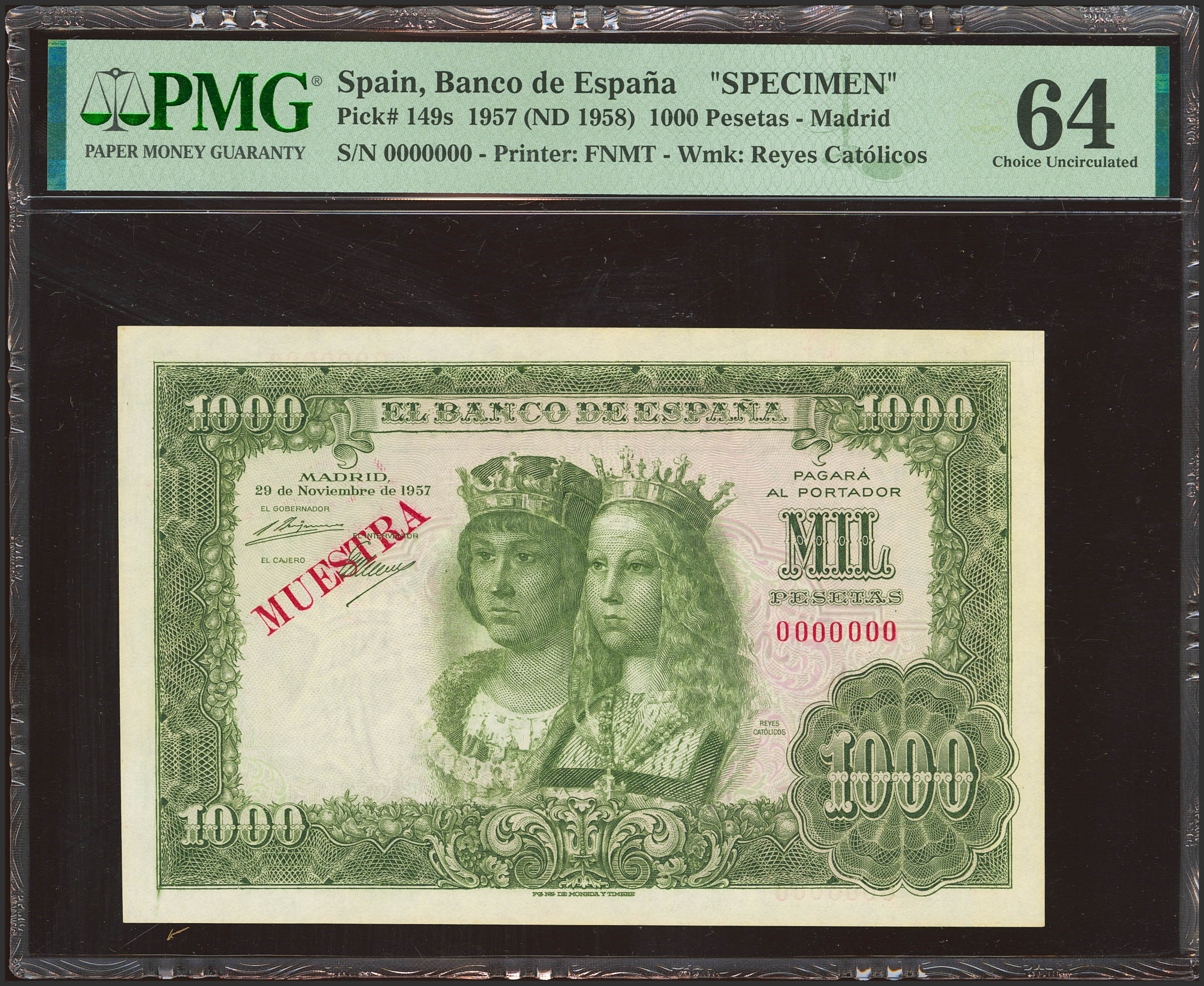 1000 Pesetas. 29 de Noviembre de 1957. MUESTRA y numeración 0000000. (Edifil 2023: 469M. Pick: 149s). Rarísimo, especialmente en esta calidad. SC. Encapsulado PMG64.