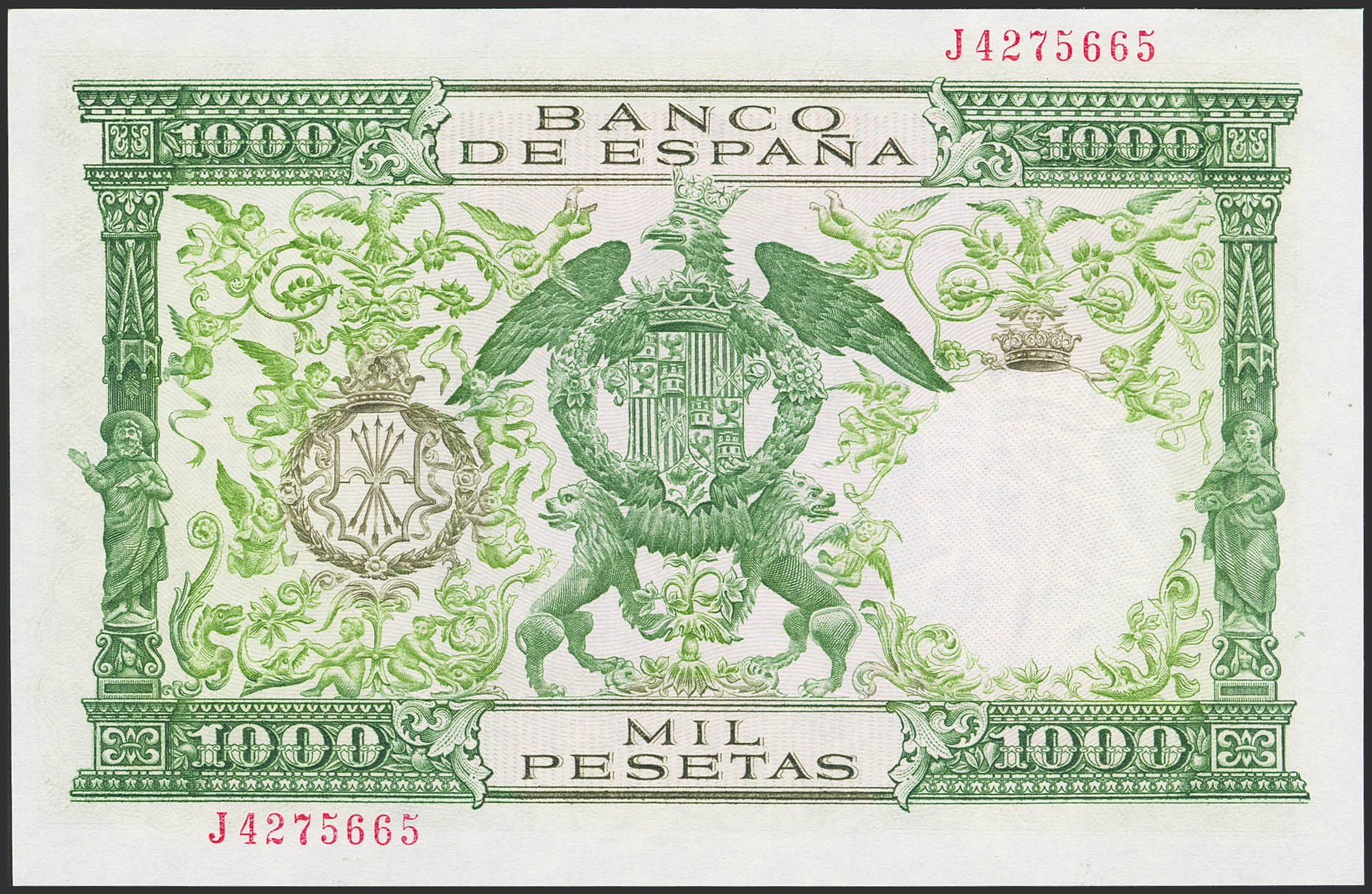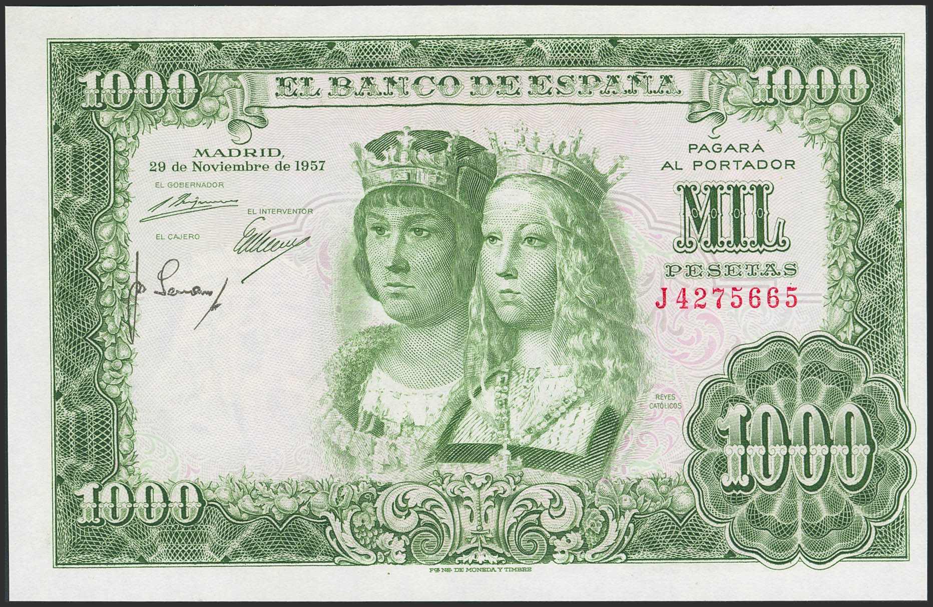 1000 Pesetas. 29 de Noviembre de 1957. Serie J. (Edifil 2023: 469b). Conserva todo su apresto original. SC-.