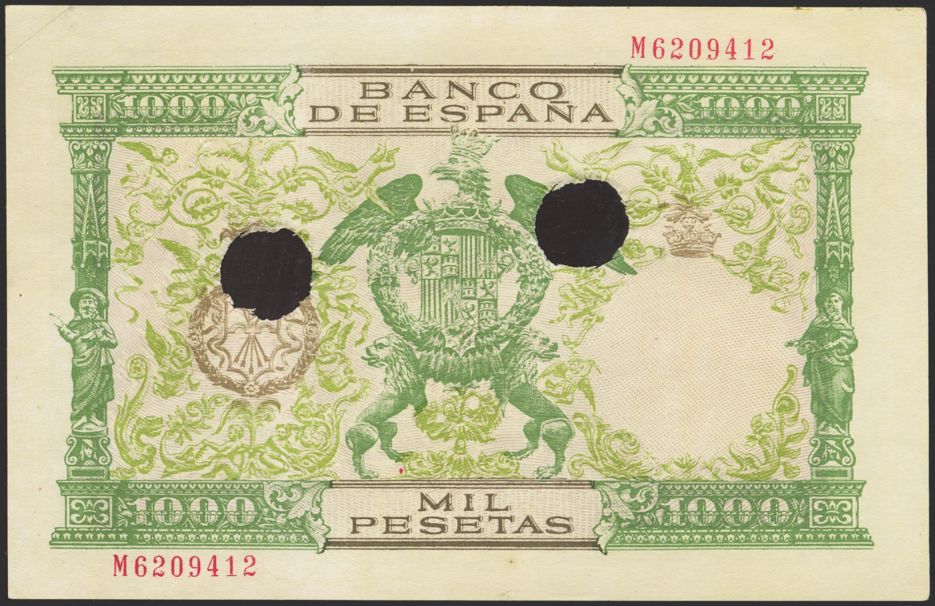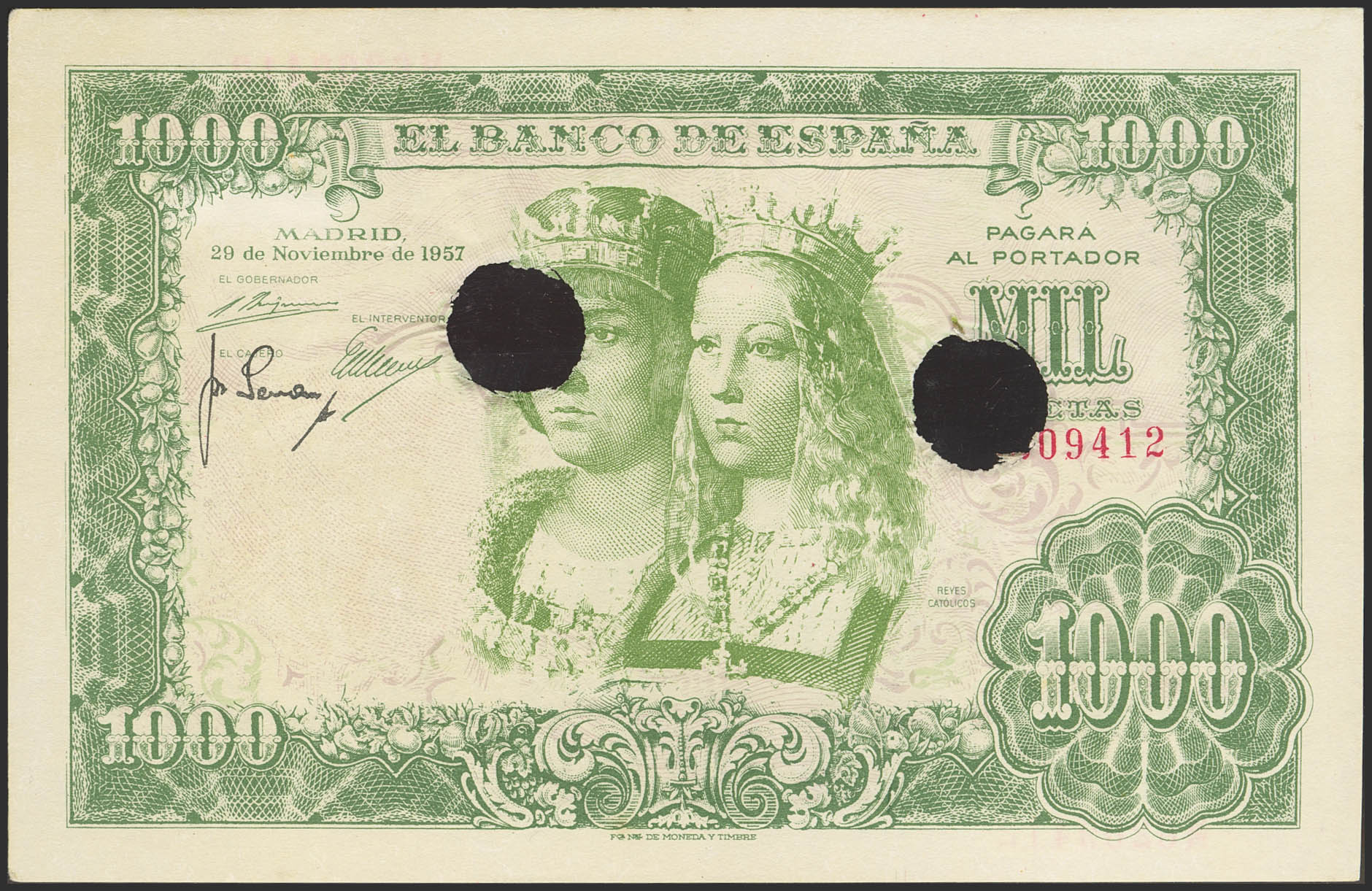 1000 Pesetas. 29 de Noviembre de 1957. Falso de época y taladrado. (Edifil 2023: 469F, Cobo: 49). Raro. EBC+.