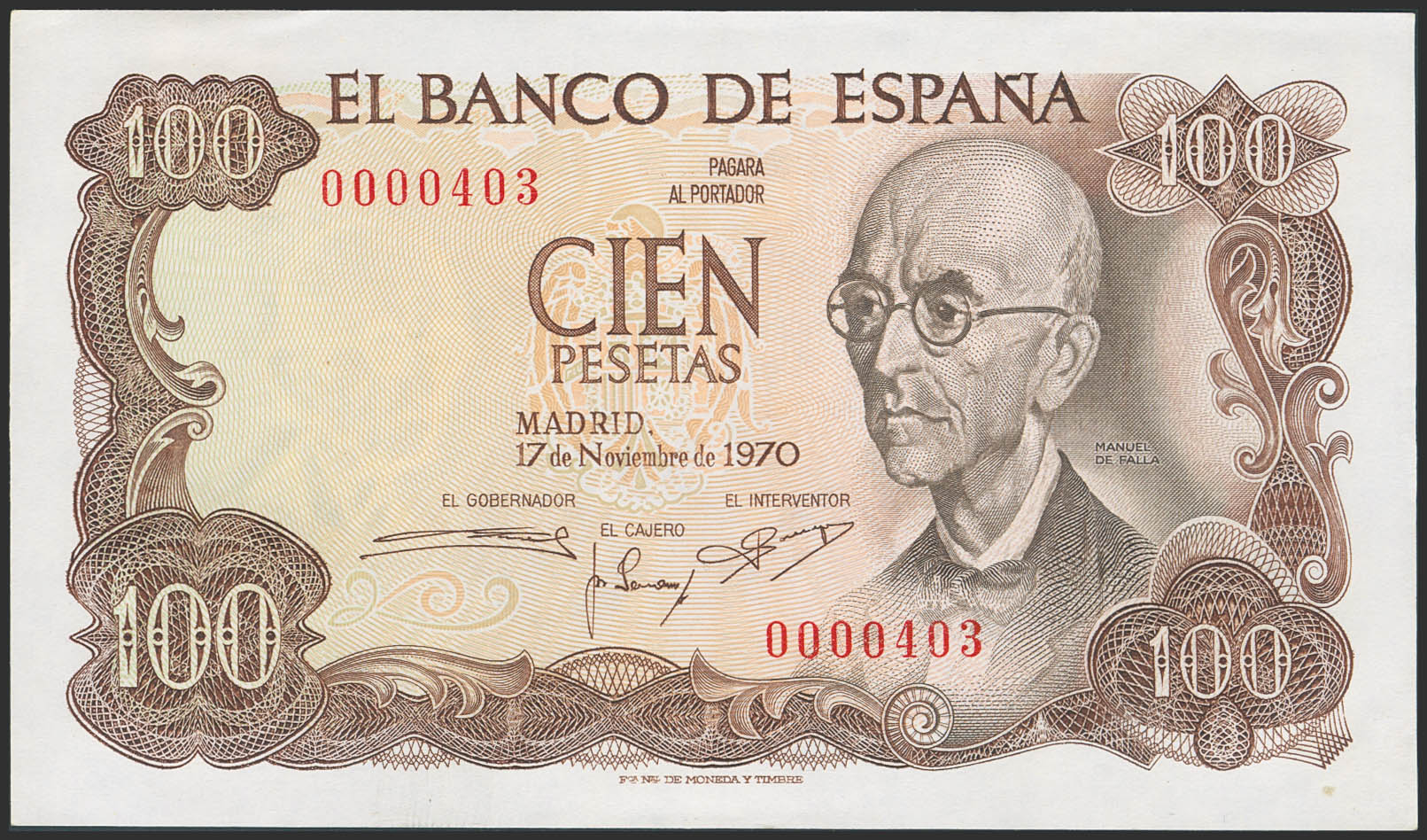 100 Pesetas. 17 de Noviembre de 1970. Sin serie y numeración bajísima (0000403). (Edifil 2023: 472). Raro con esta numeración, apresto original. SC-.