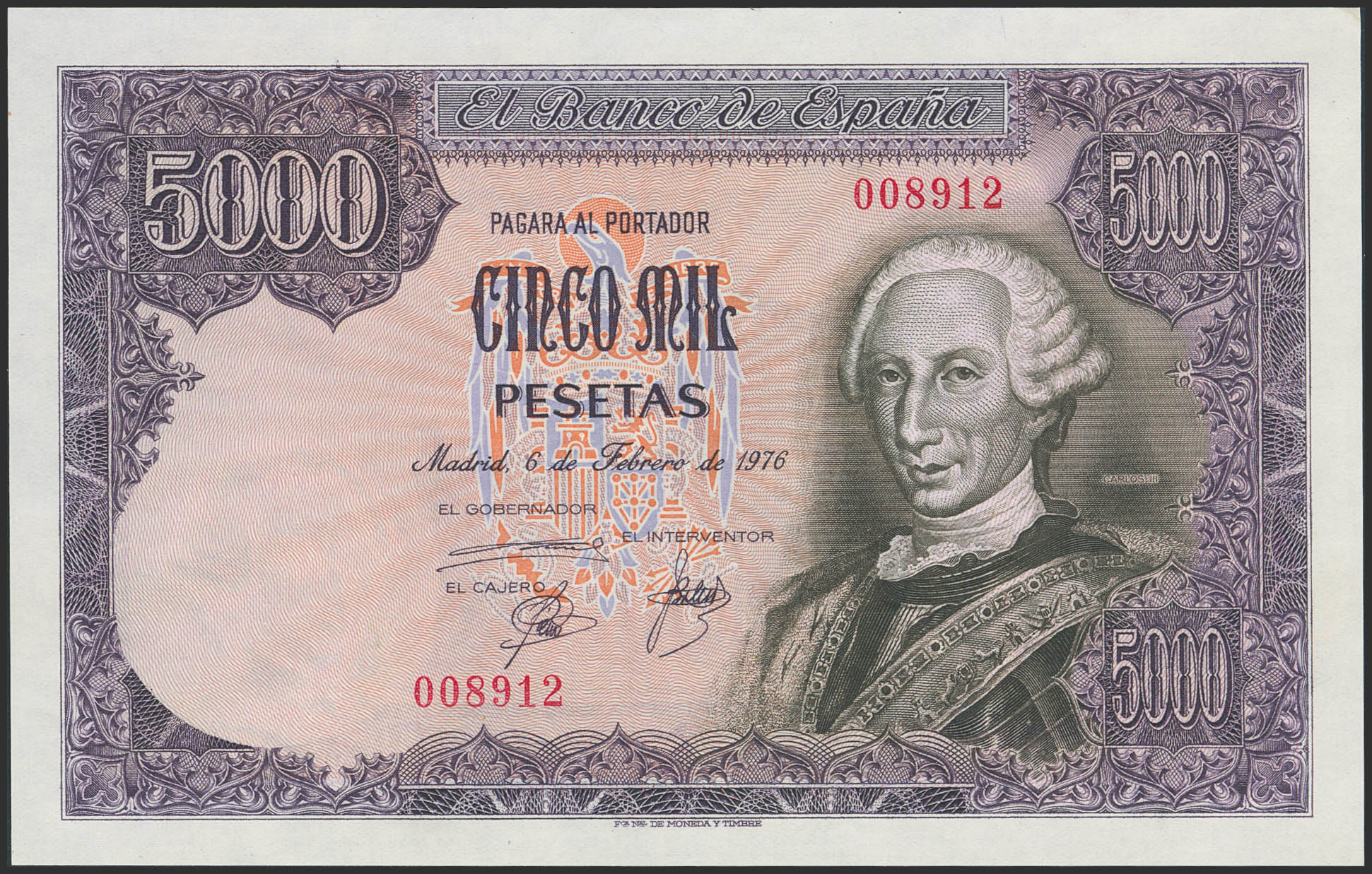 5000 Pesetas. 6 de Febrero de 1976. Sin serie y baja numeración. (Edifil 2023: 475). SC-.