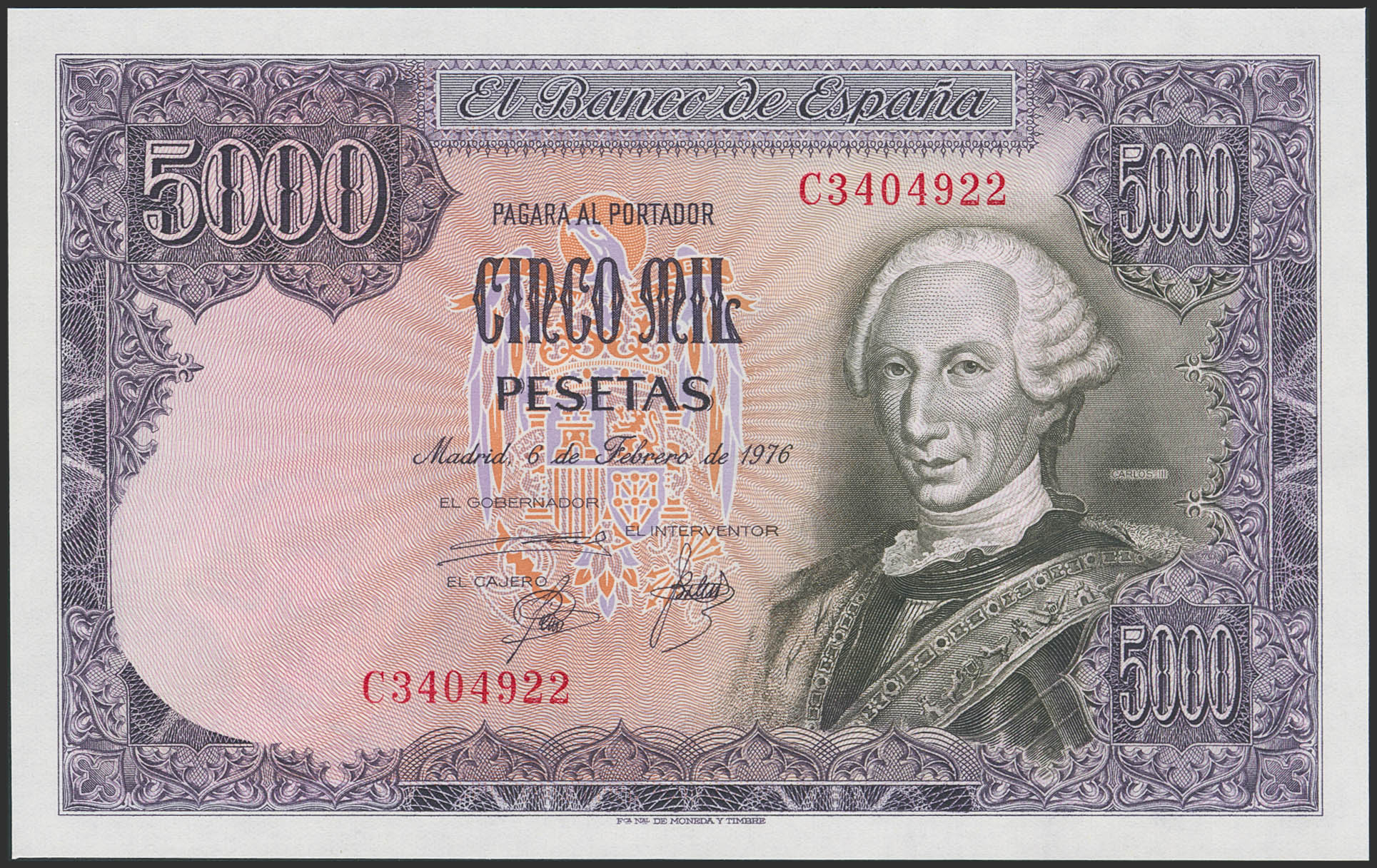 5000 Pesetas. 6 de Febrero de 1976. Serie C. (Edifil 2023: 475a). Apresto original. SC.