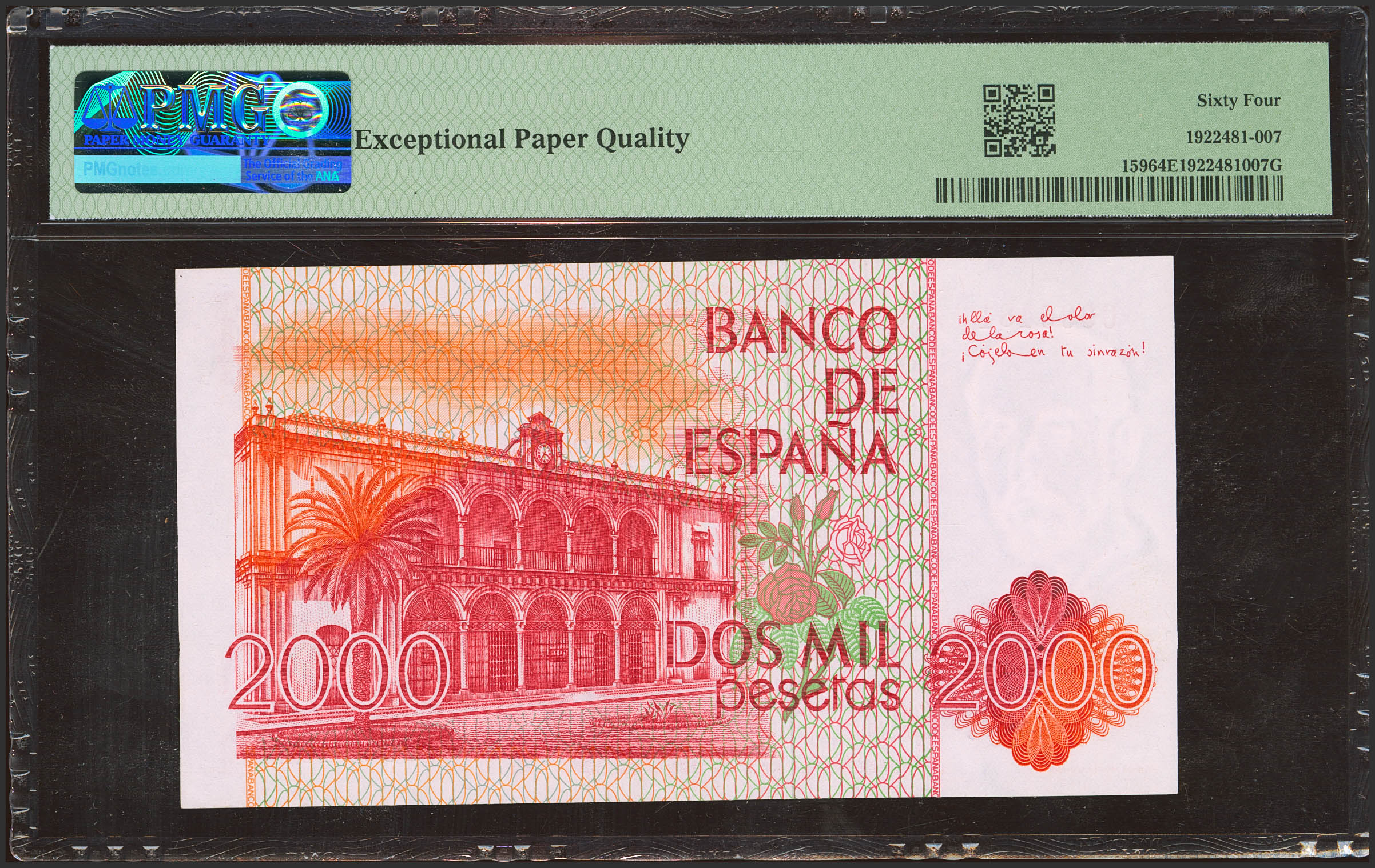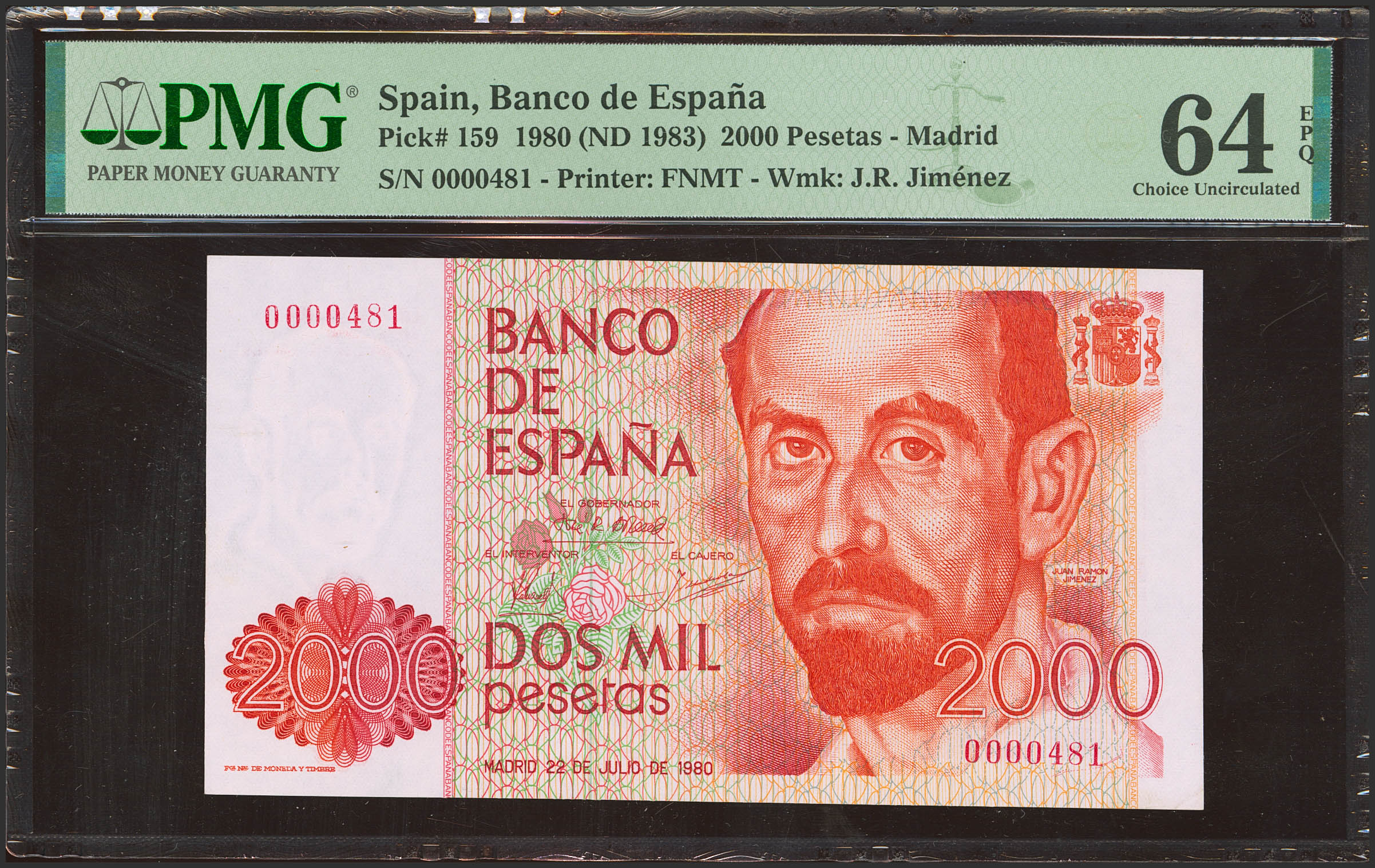2000 Pesetas. 22 de Julio de 1980. Sin serie y numeración bajísima (0000481). (Edifil 2023: 479, Pick: 162). Muy raro. SC. Encapsulados PMG64EPQ.