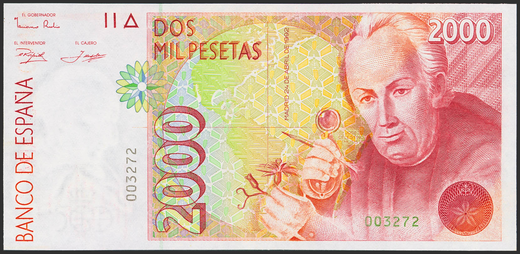 2000 Pesetas. 24 de Abril de 1992. Pareja correlativa. Sin serie y numeración bajísima. (Edifil 2023: 482). SC.