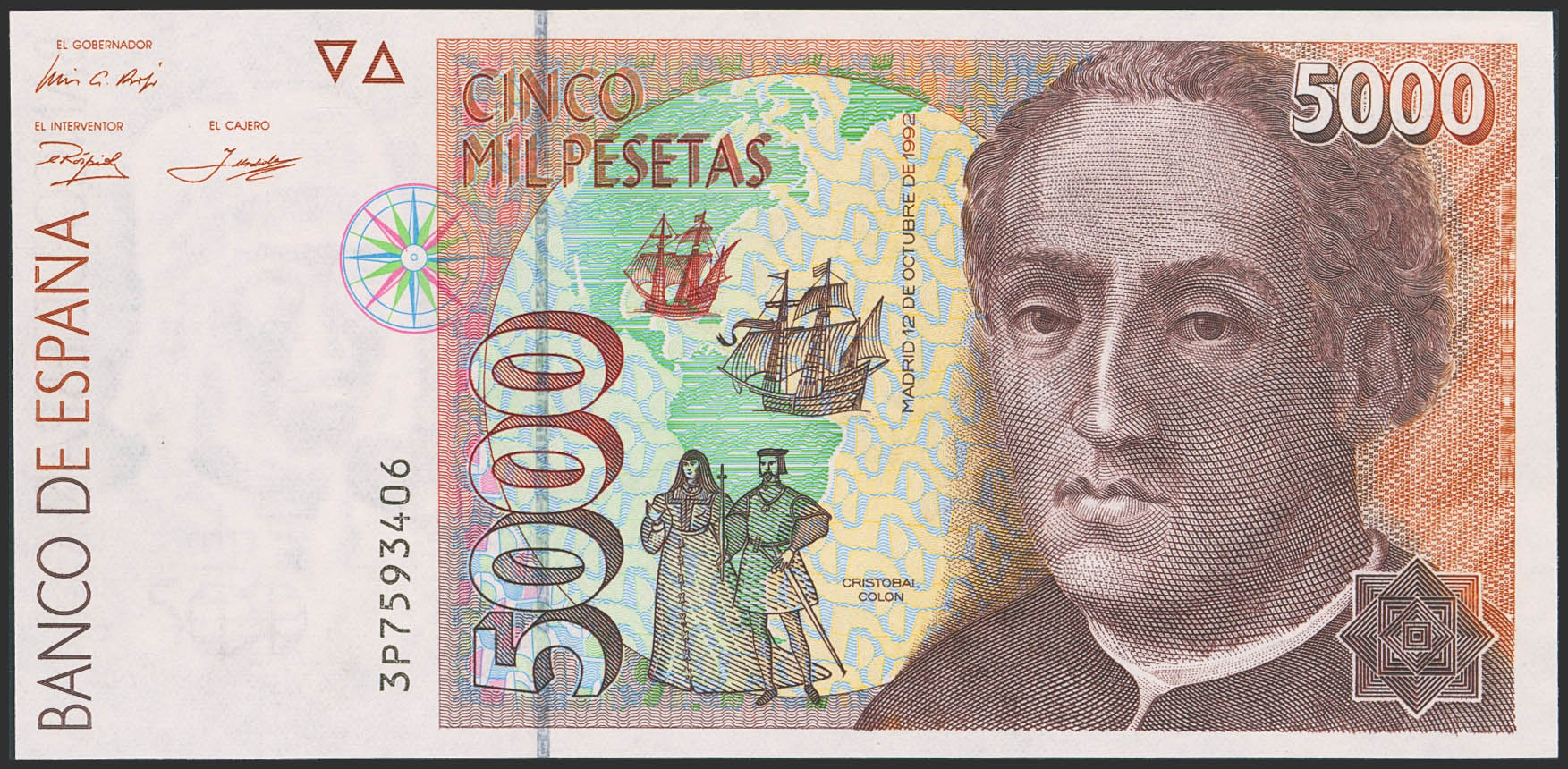 5000 Pesetas. 12 de Octubre de 1992. Serie 3P. (Edifil 2023: 484a). SC.
