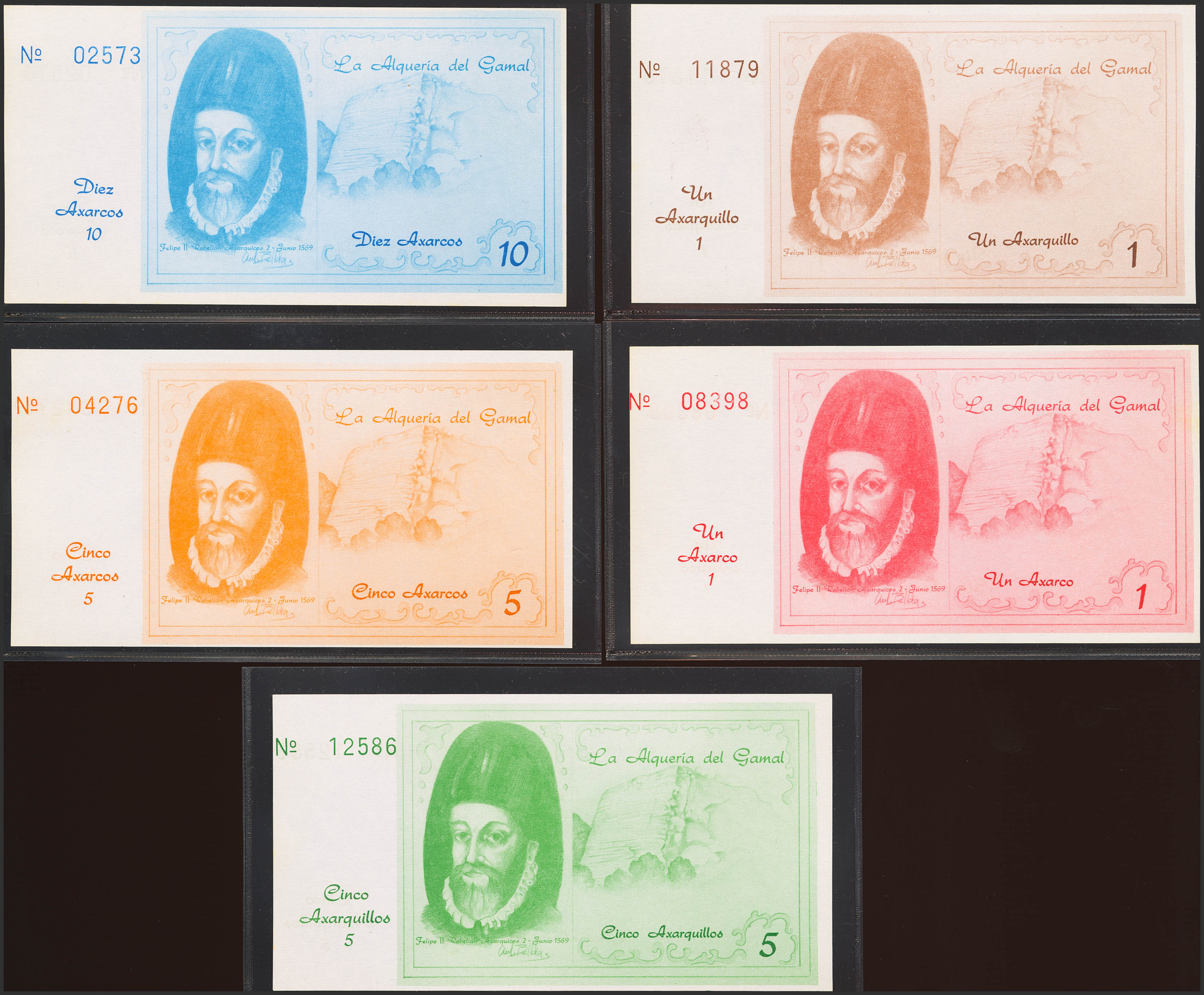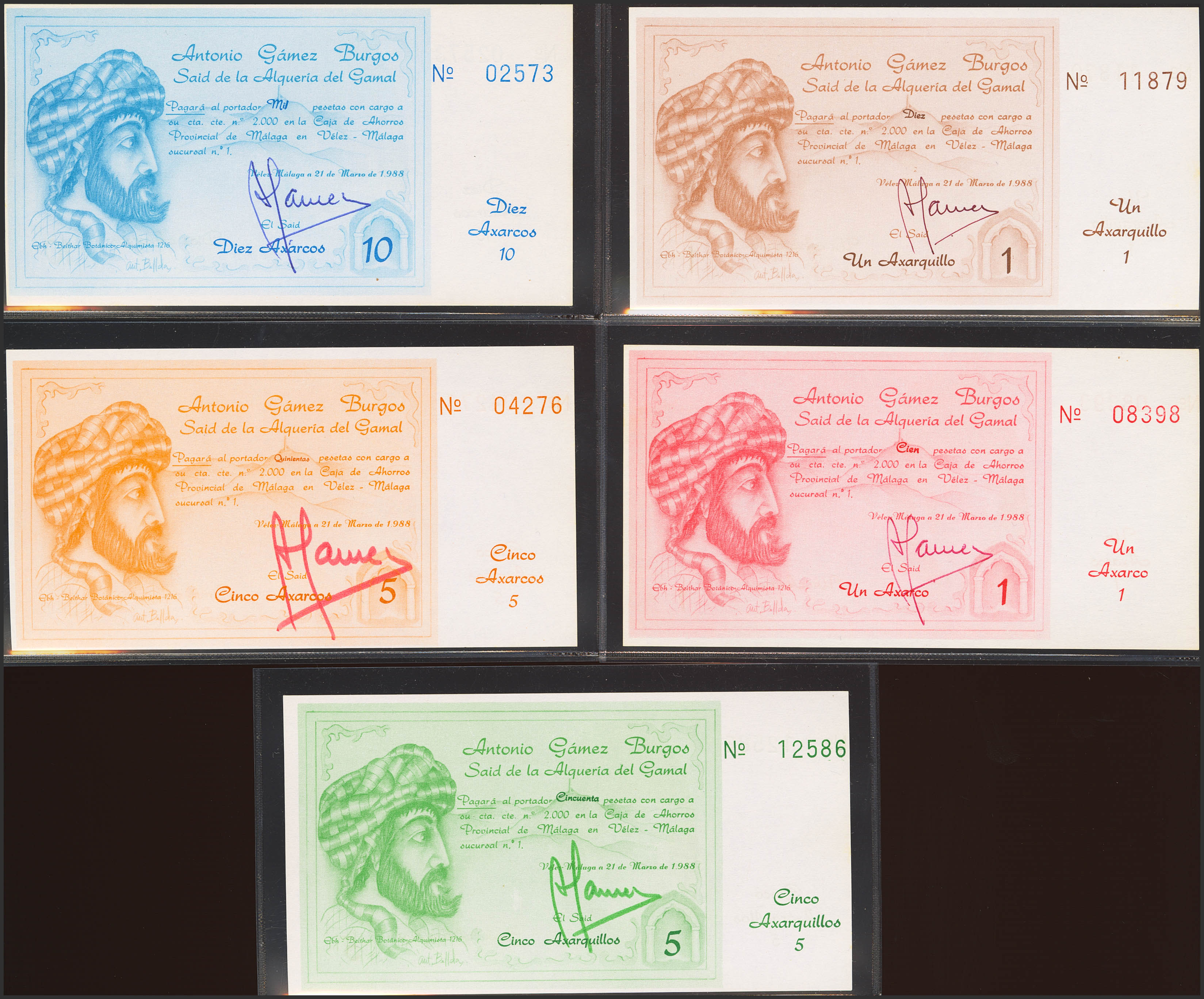 Serie de 5 billetes de 1 y 5 Axarquillos y de 1, 5 y 10 Axarcos. 21 Marzo 1988. Vélez, Málaga. Antonio Gámez Burgos, Said de la Arquería de Gamal. Se incluye su carpeta de presentación (manuscrita). SC.
