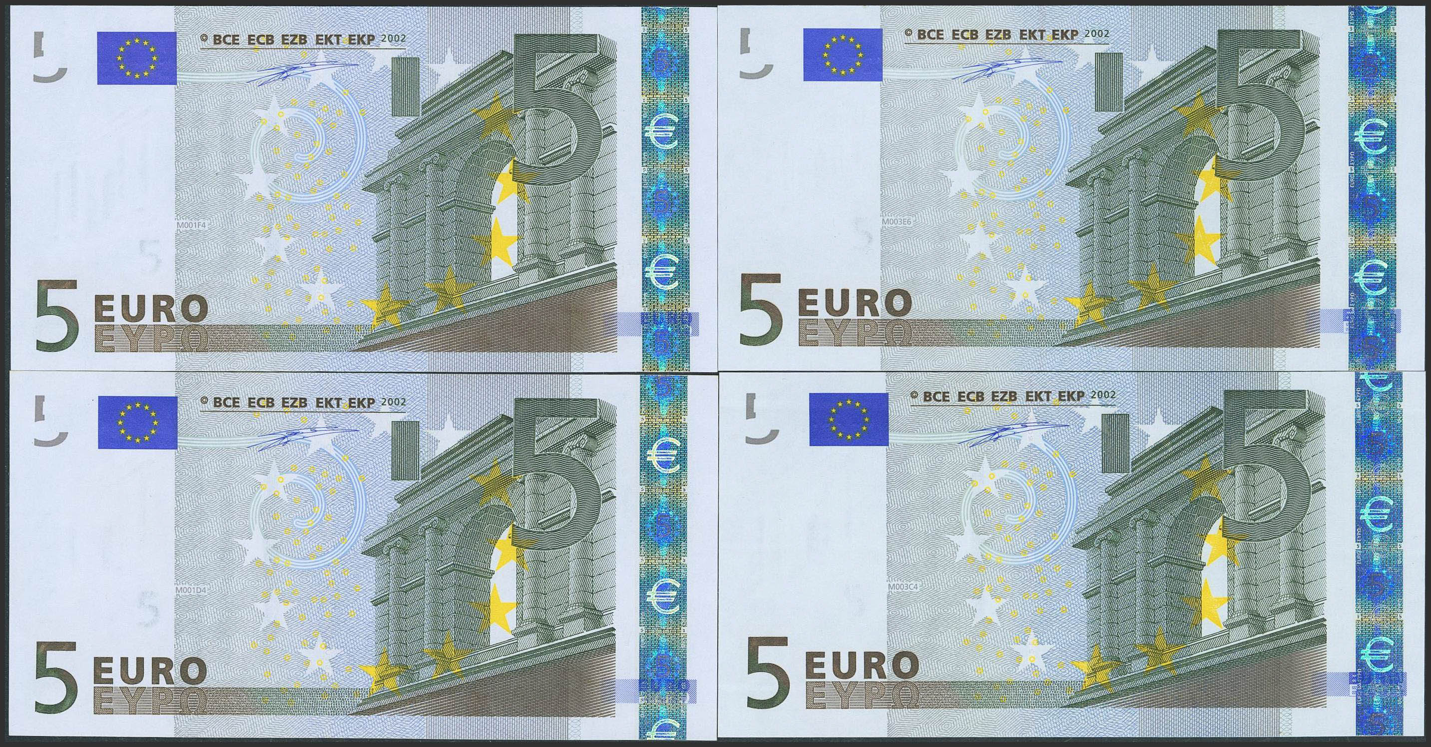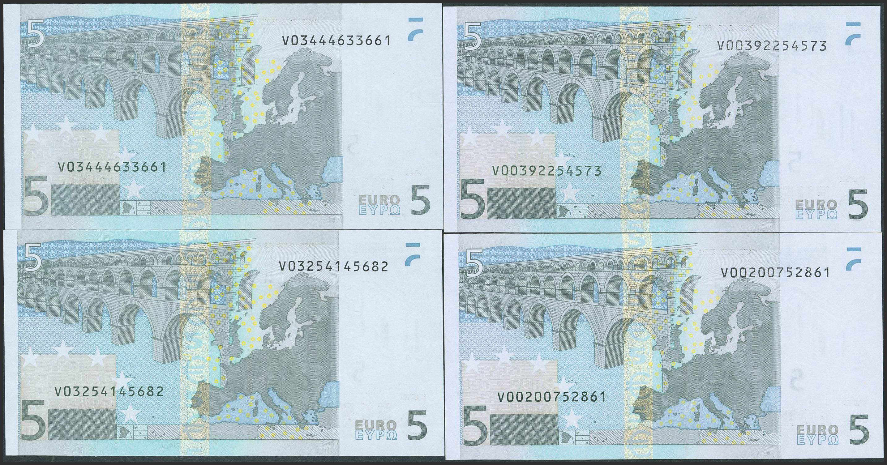 Conjunto de 4 billetes de 5 Euros, emitidos el 1 de Enero de 2002 con la Firma Duisenberg y la serie V (España). (Edifil 2023: 486). SC.