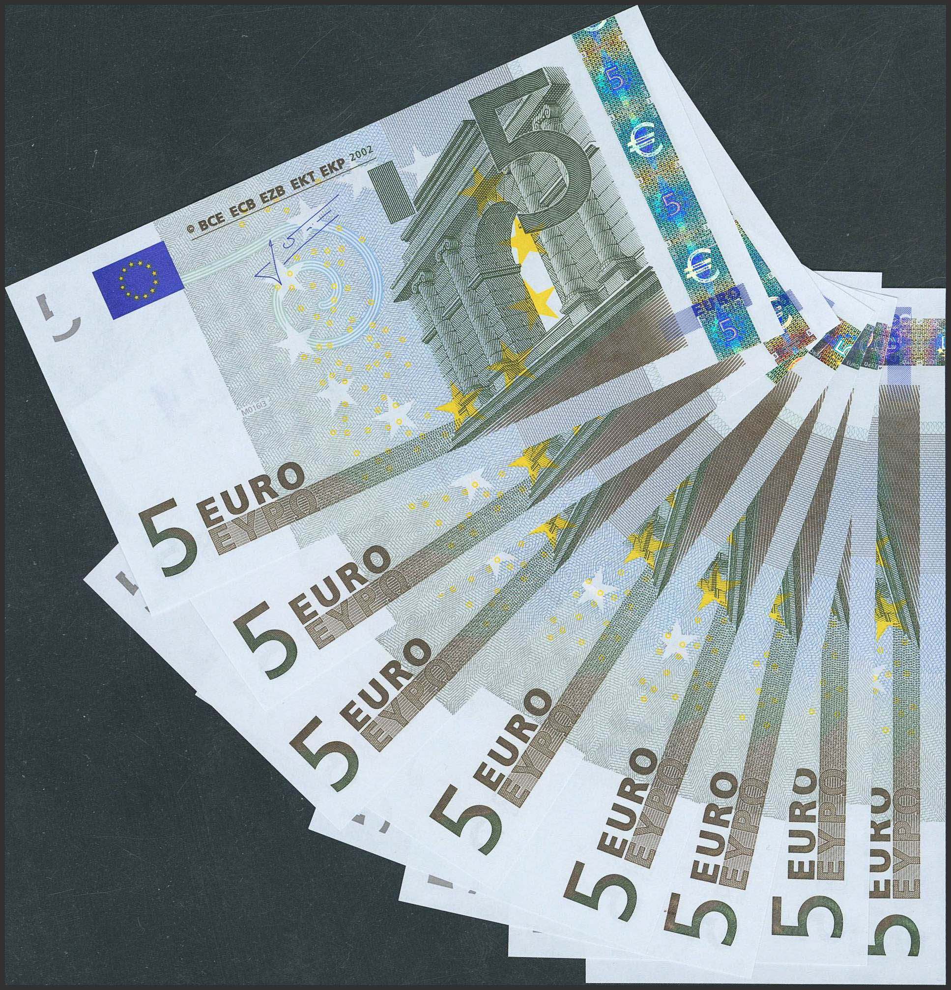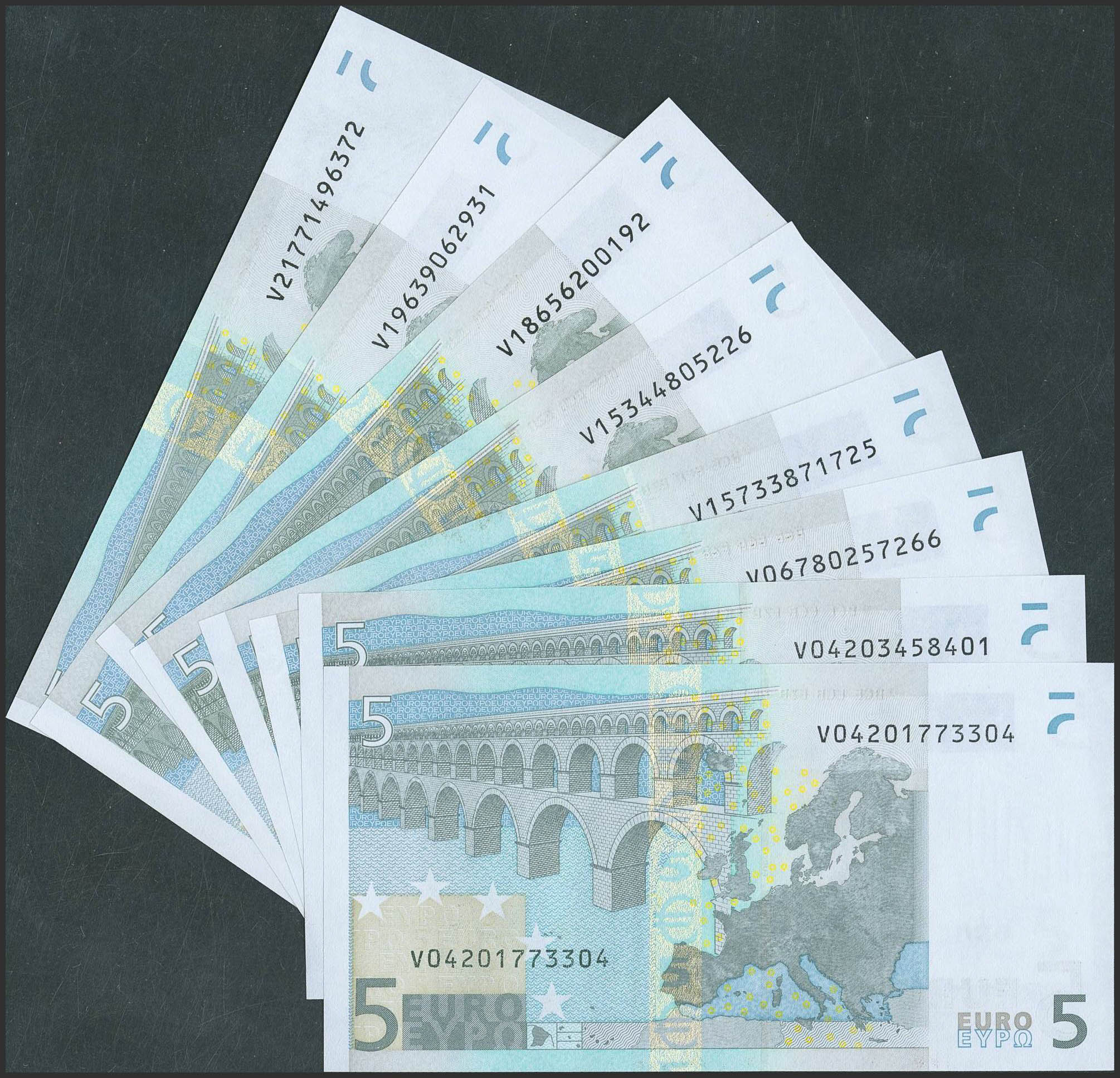 Conjunto de 8 billetes de 5 Euros, emitidos el 1 de Enero de 2002 con la Firma Trichet y la serie V (España). (Edifil 2023: 486A). SC.