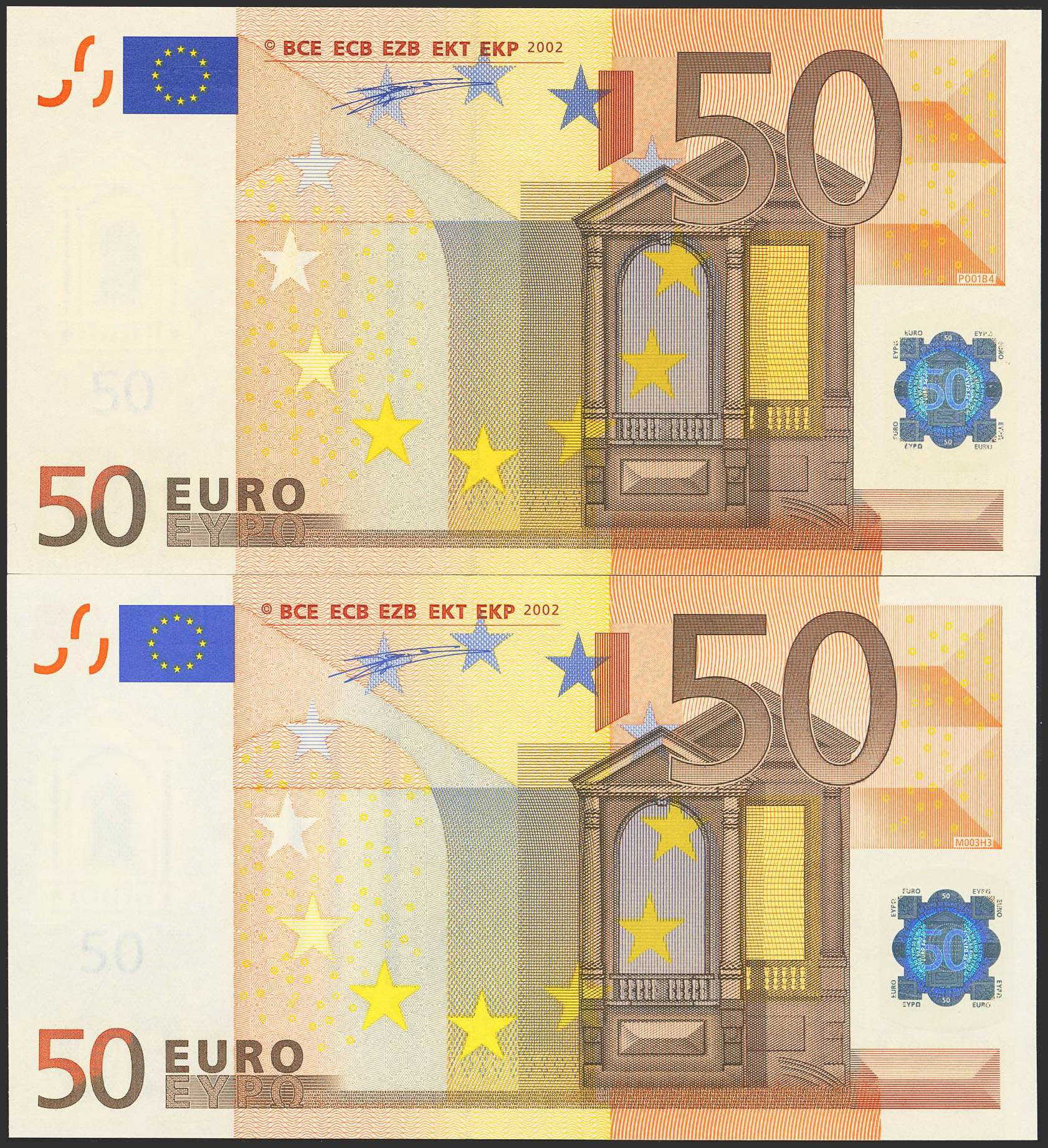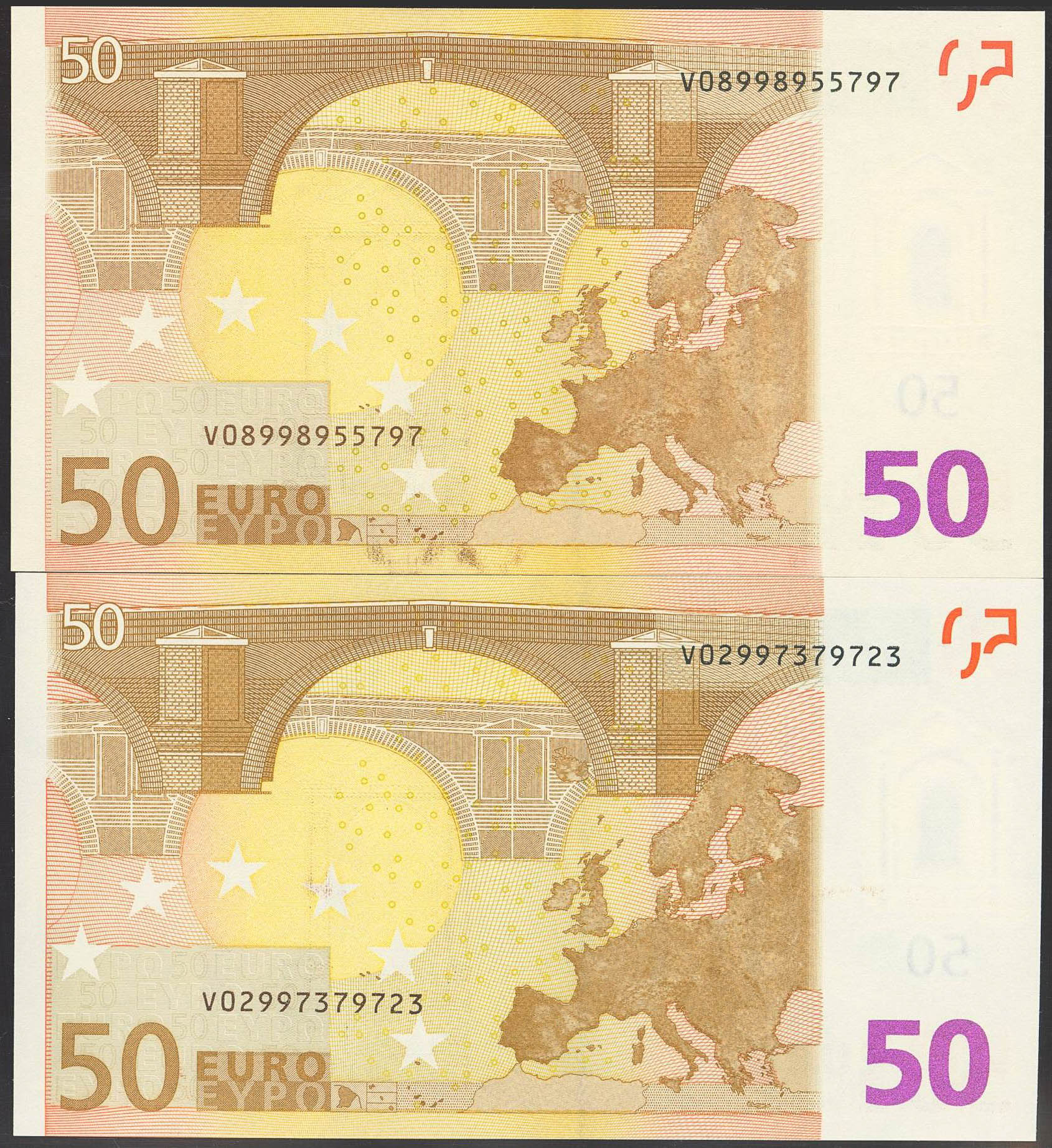 Conjunto de 2 billetes de 50 Euros emitidos en 1 de Enero de 2002 con la Firma Duisenberg y la serie V (España). (Edifil 2023: 489). SC.