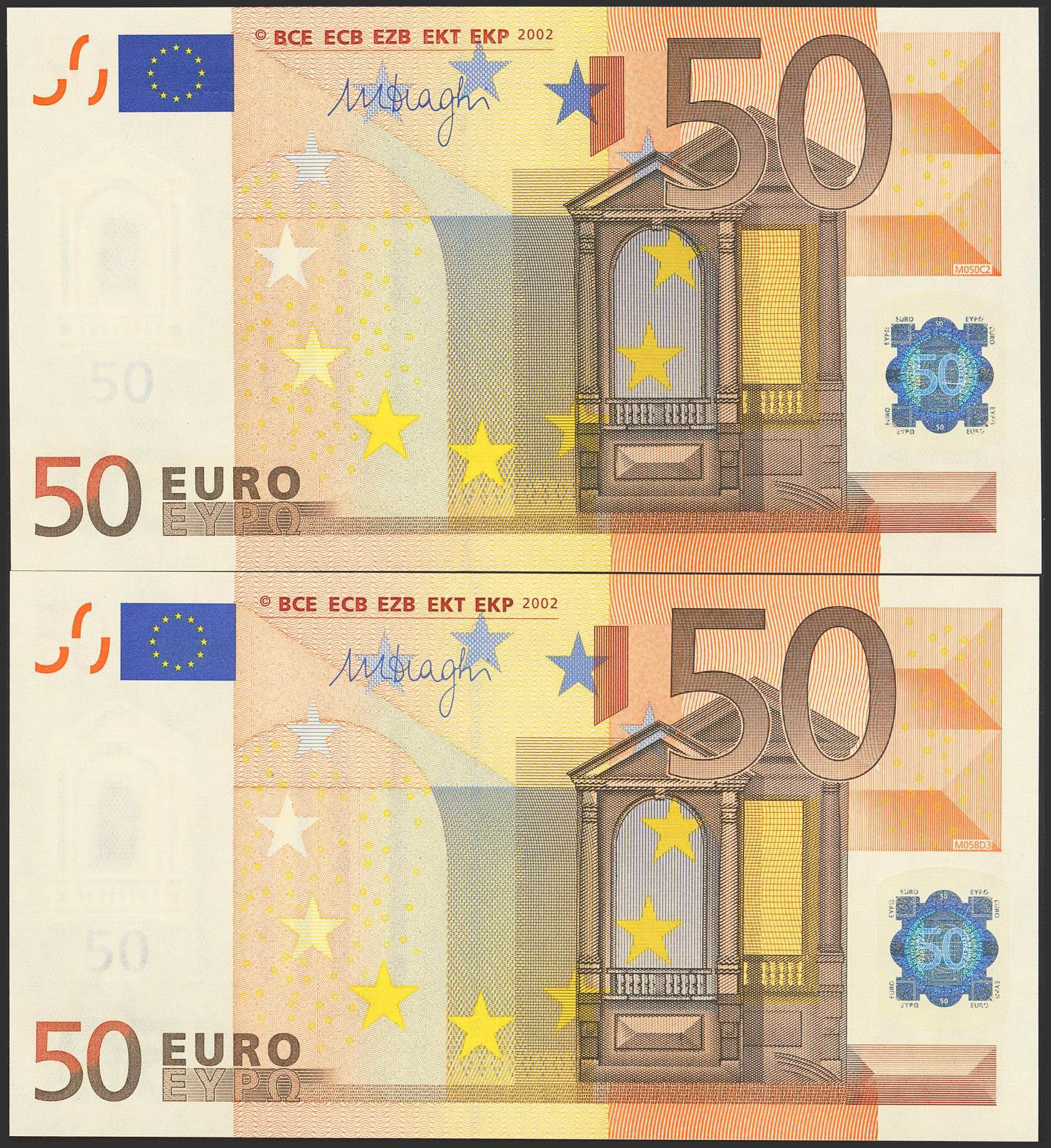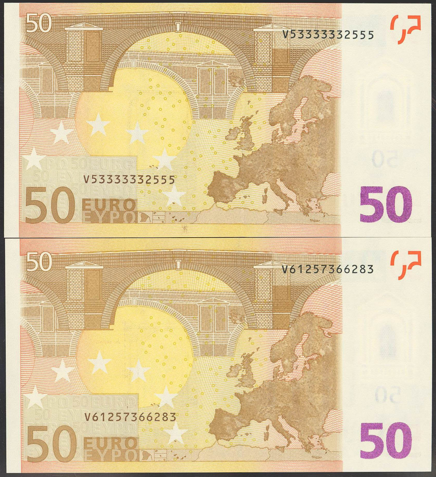 Conjunto de 2 billetes de 50 Euros emitidos en 1 de Enero de 2002 con la Firma Draghi y la serie V (España). (Edifil 2023: 489B). SC.
