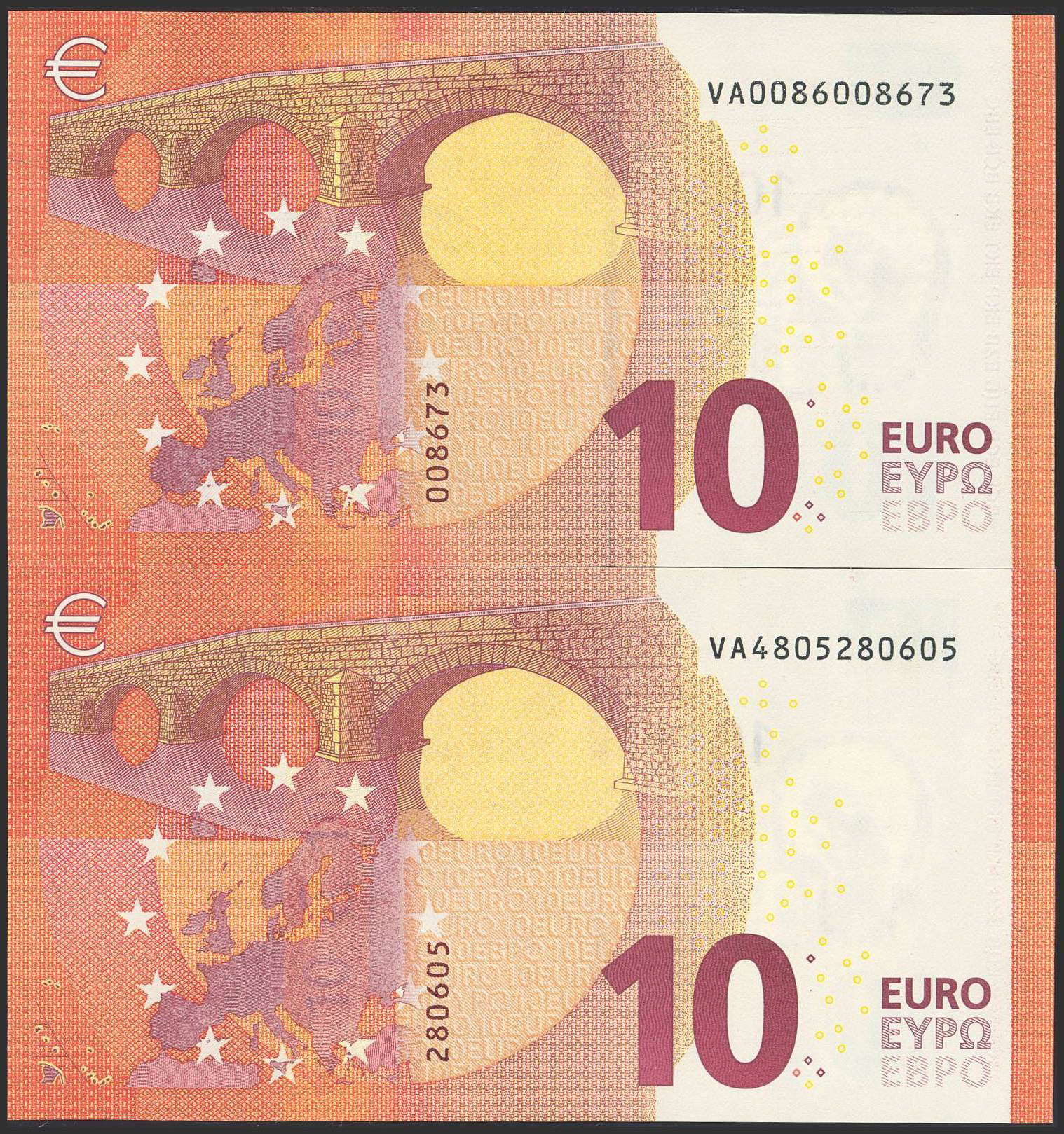 Conjunto de 2 billetes de 10 Euros emitidos en 2013 con la Firma Draghi y la serie V (España). (Edifil 2023: 494). SC.