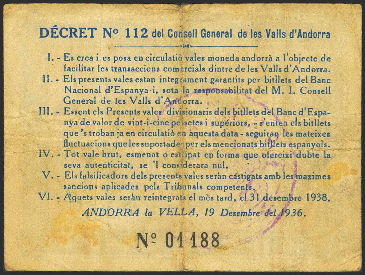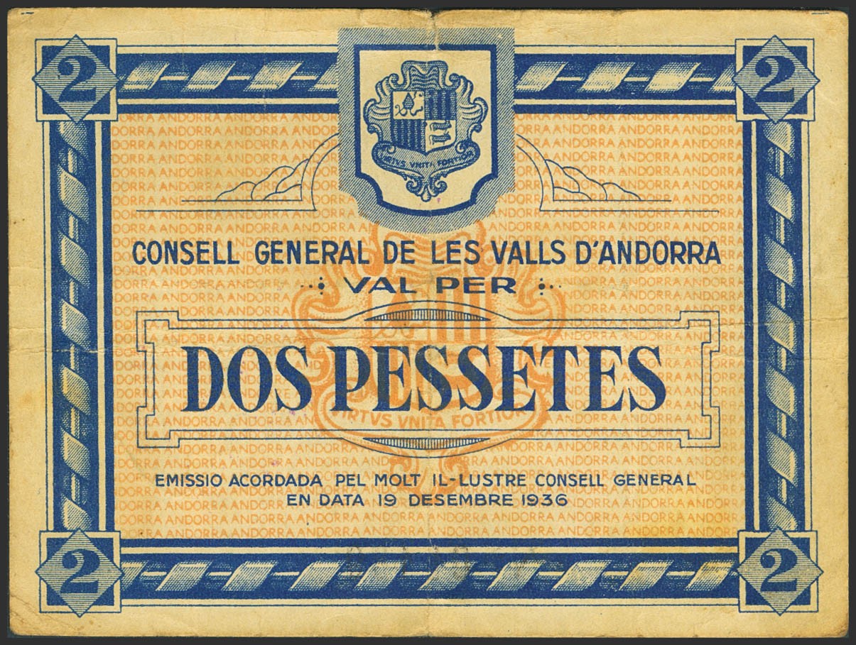 ANDORRA. 2 Pessetes. 19 de Diciembre de 1936. Sin serie. (Edifil 2023: 4). Raro. MBC+.