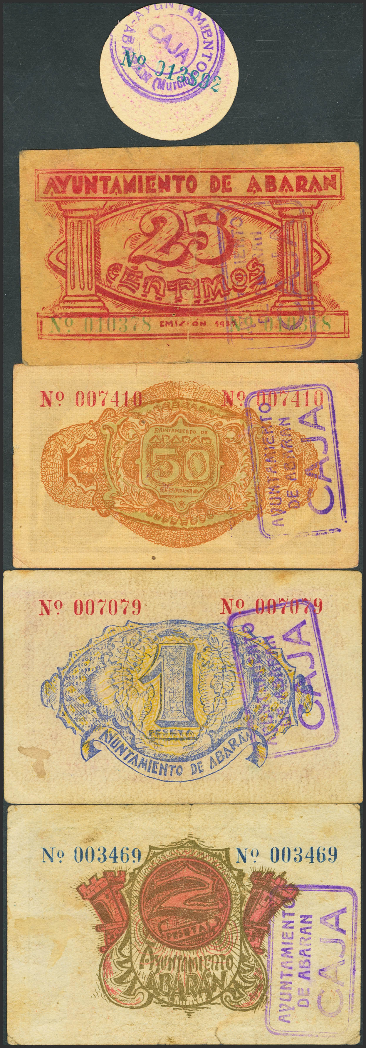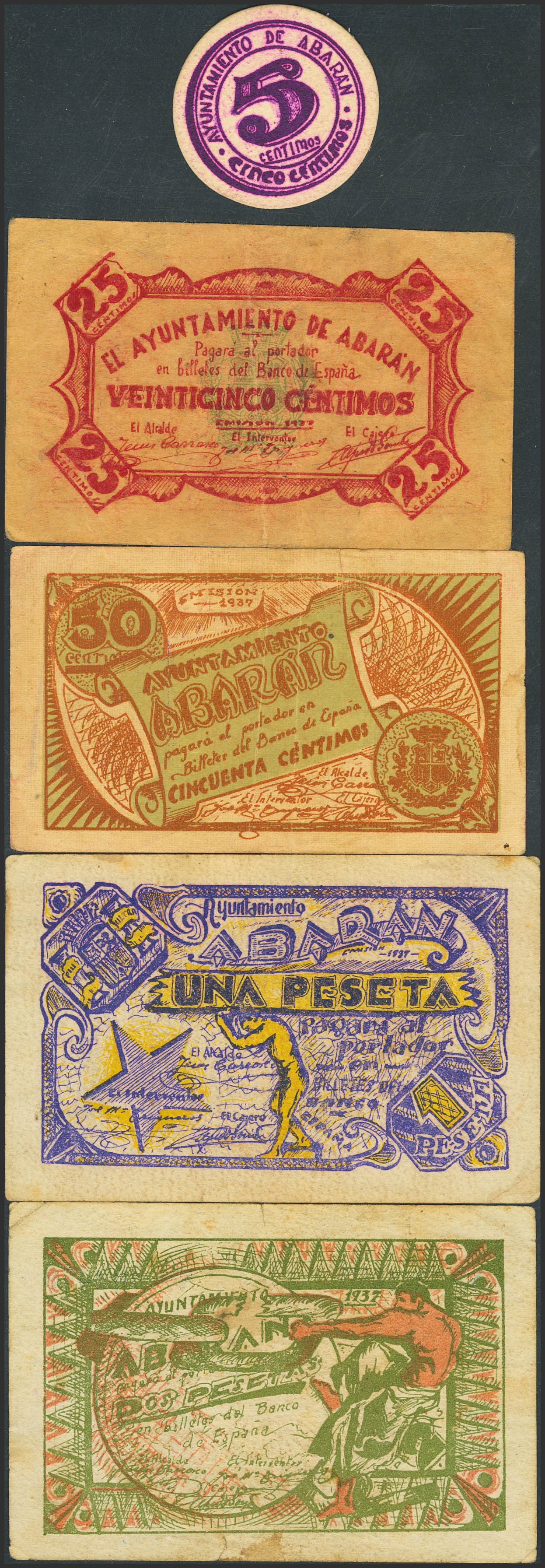 ABARAN (MURCIA). 5 Céntimos, 25 Céntimos, 50 Céntimos, 1 Peseta y 2 Pesetas. 1937. (González: 15/19). Rara serie completa. SC--/MBC-.