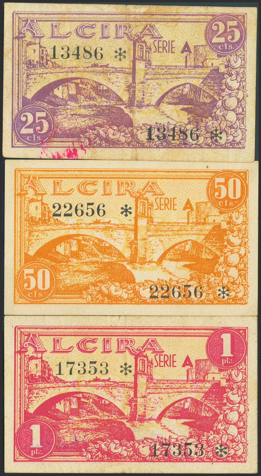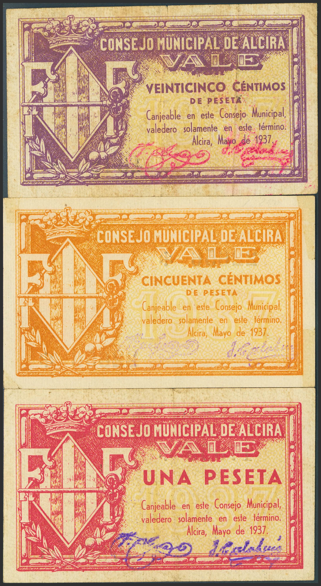 ALCIRA (VALENCIA). 25 Céntimos, 50 Céntimos y 1 Peseta. Mayo de 1937. (González: 324/26). Serie completa. SC-/MBC.