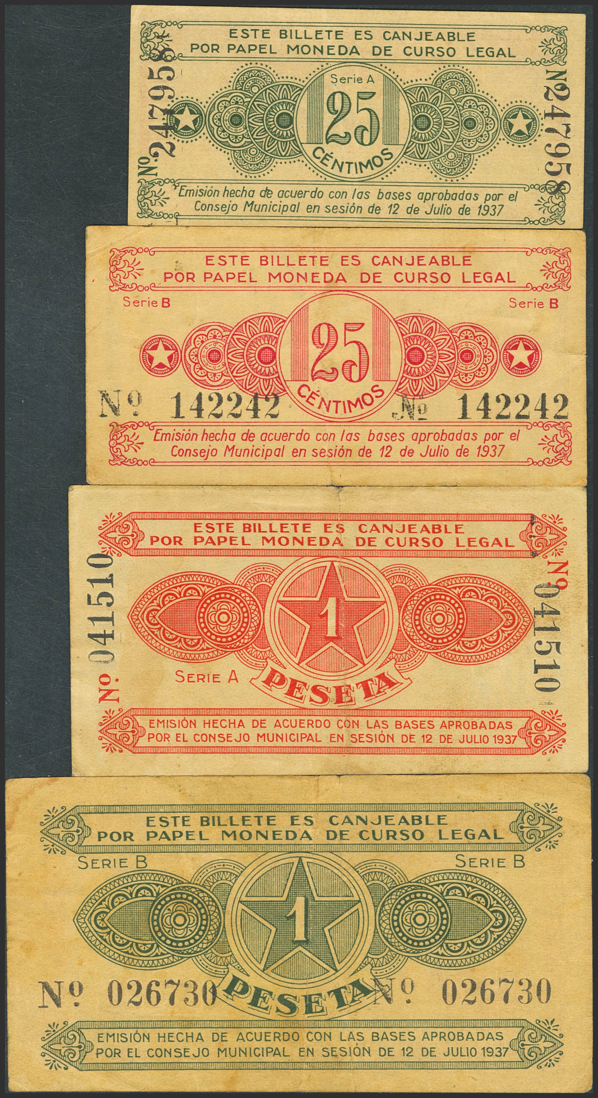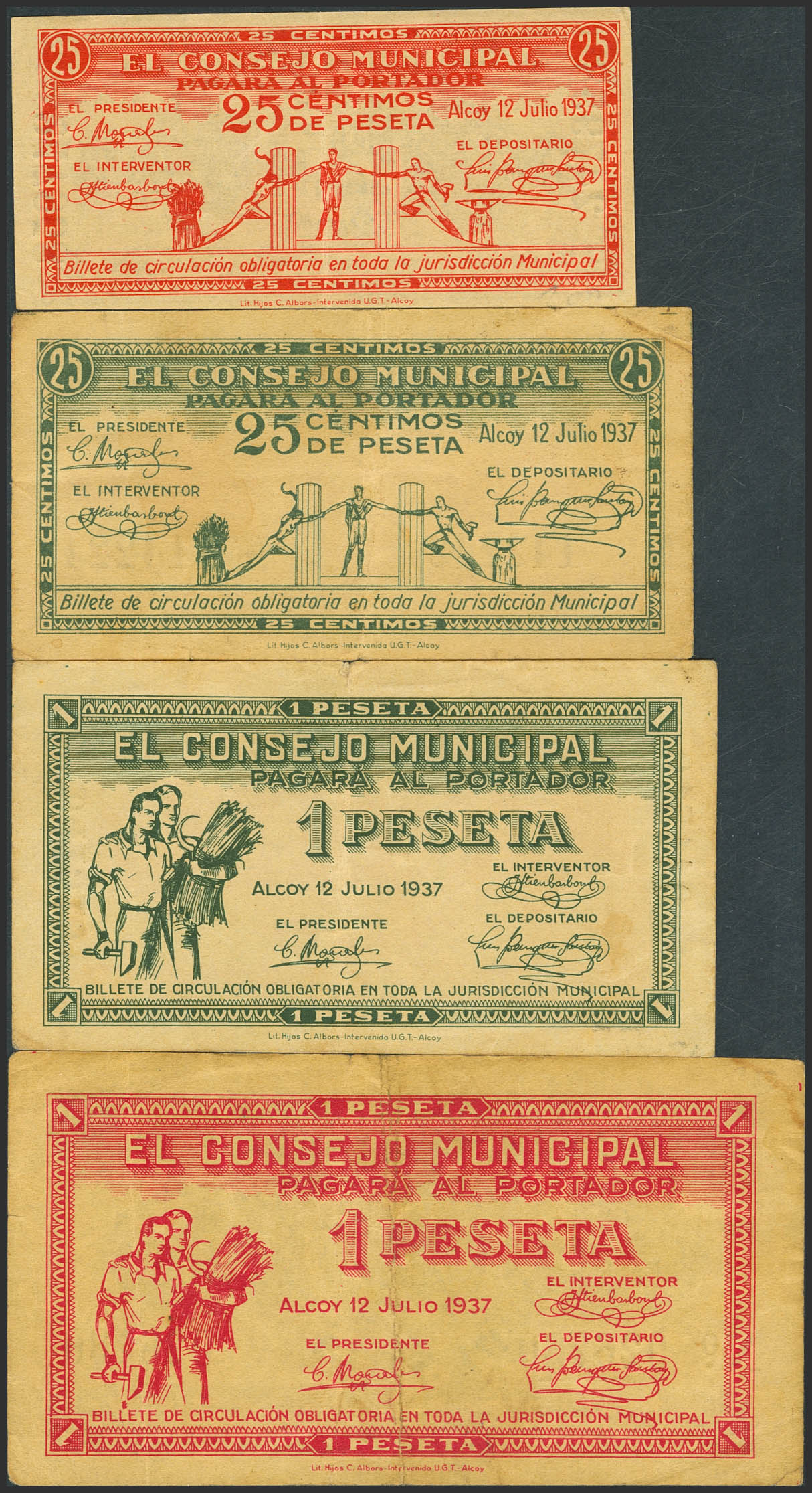 ALCOY (ALICANTE). 25 Céntimos (2) y 1 Peseta (2). 12 Julio de 1937. (González: 377/80). Serie completa. EBC/MBC.