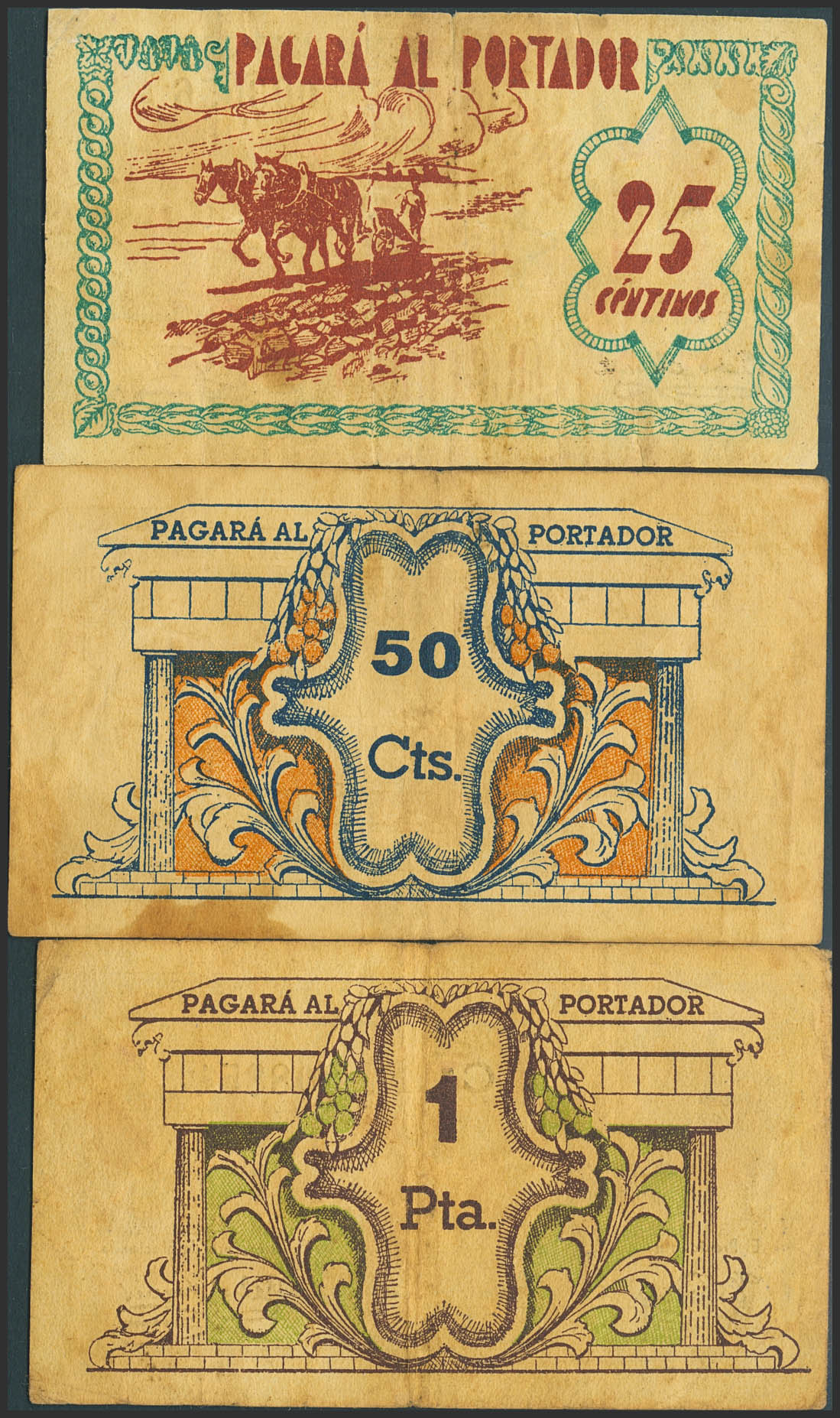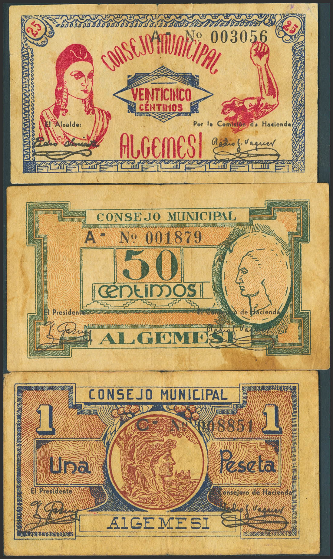 ALGEMESI (VALENCIA). 25 Céntimos, 50 Céntimos y 1 Peseta. (1937ca). (González: 475/77). Inusual serie completa. MBC.
