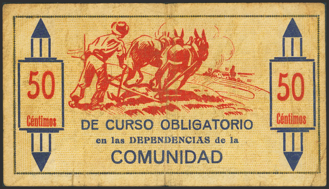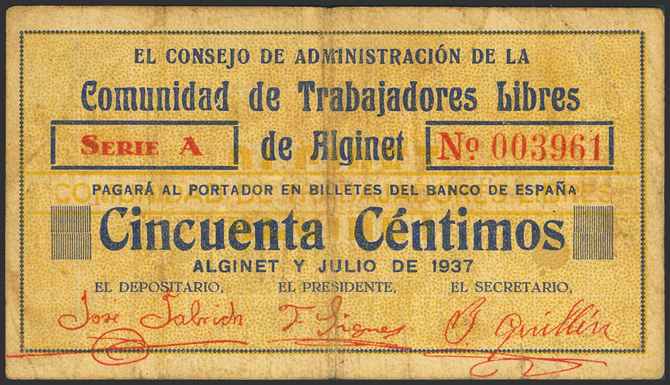 ALGINET (VALENCIA). 50 Céntimos. Julio de 1937. Serie A. (González: 486). Muy raro. MBC.