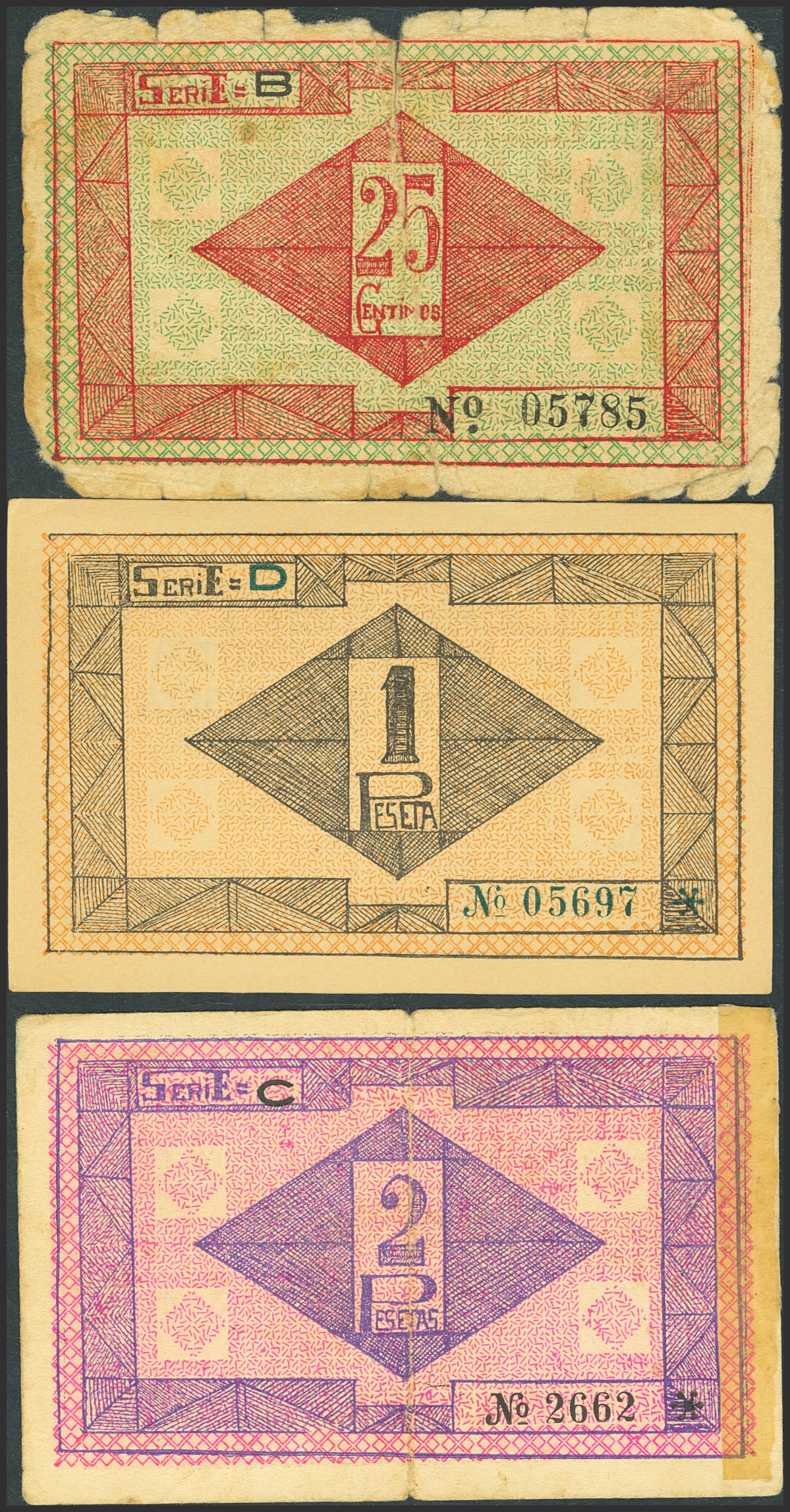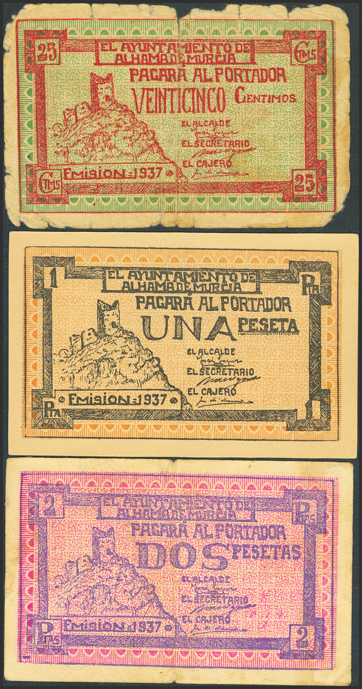 ALHAMA DE MURCIA (MURCIA). 25 Céntimos, 1 Peseta y 2 Pesetas. 1937. (González: 495/97). Serie completa. BC-/SC-.