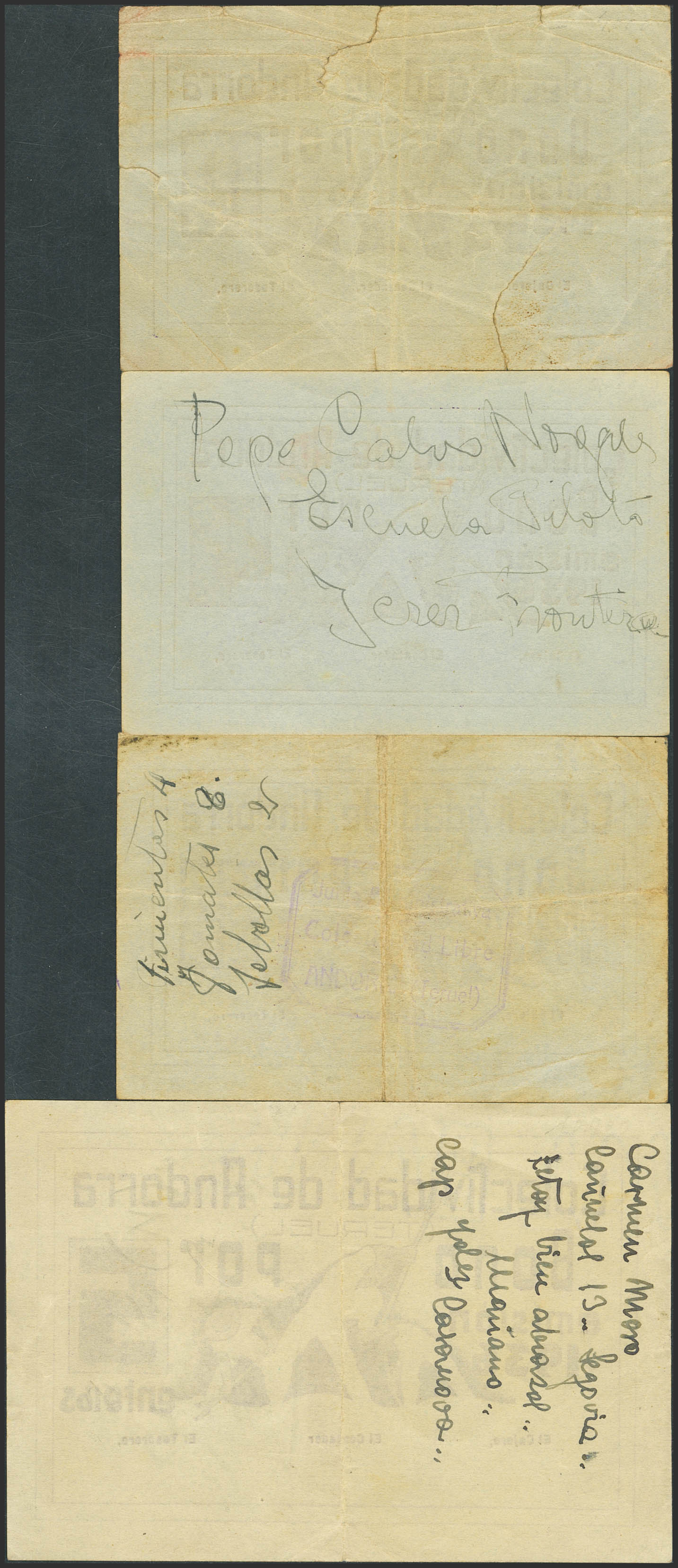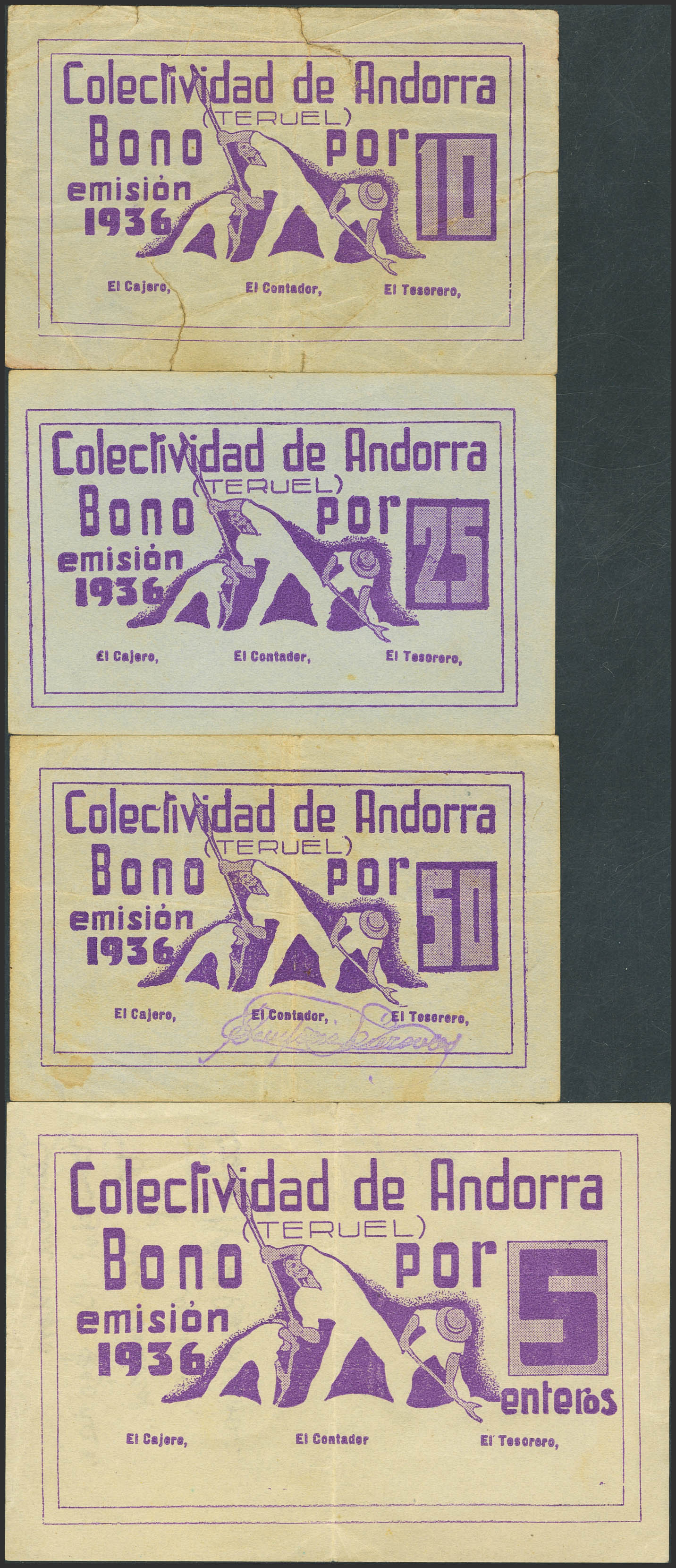 ANDORRA (TERUEL). 10 ¿Céntimos?, 25 ¿Céntimos?, 50 ¿Céntimos? y 5 Enteros. 1936. (González: 687, 688, 689, 692). Inusuales. EBC+/MBC-.