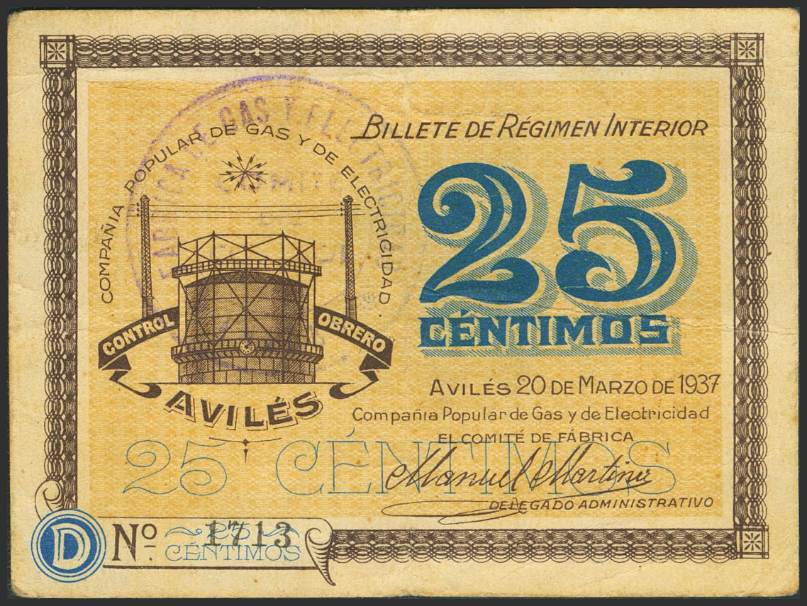 AVILES (ASTURIAS). 25 Céntimos. 20 de Marzo de 1937. Serie D. (González: 799). Raro. MBC-.
