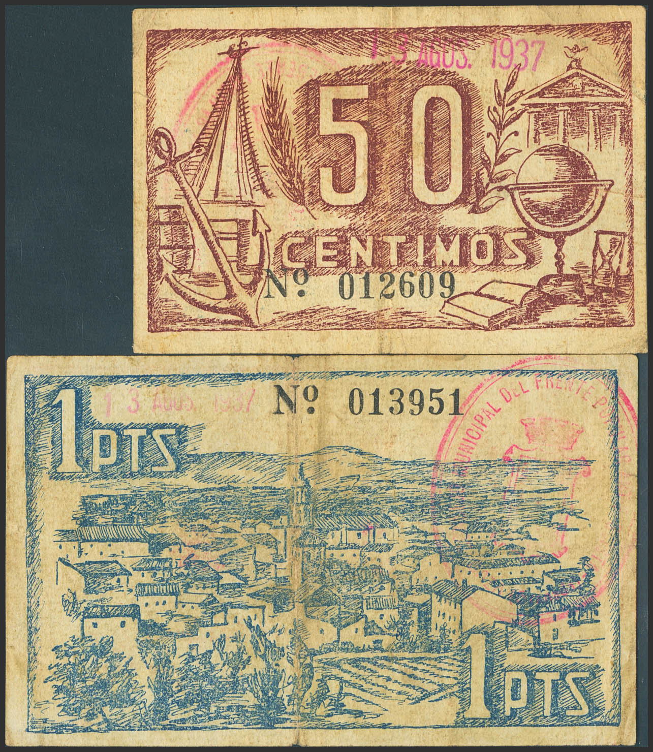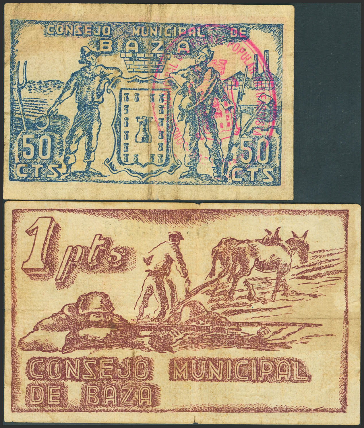 BAZA (GRANADA). 50 Céntimos y 1 Peseta. 13 de Agosto de 1937. (González: 904/05). Inusual serie completa. MBC.