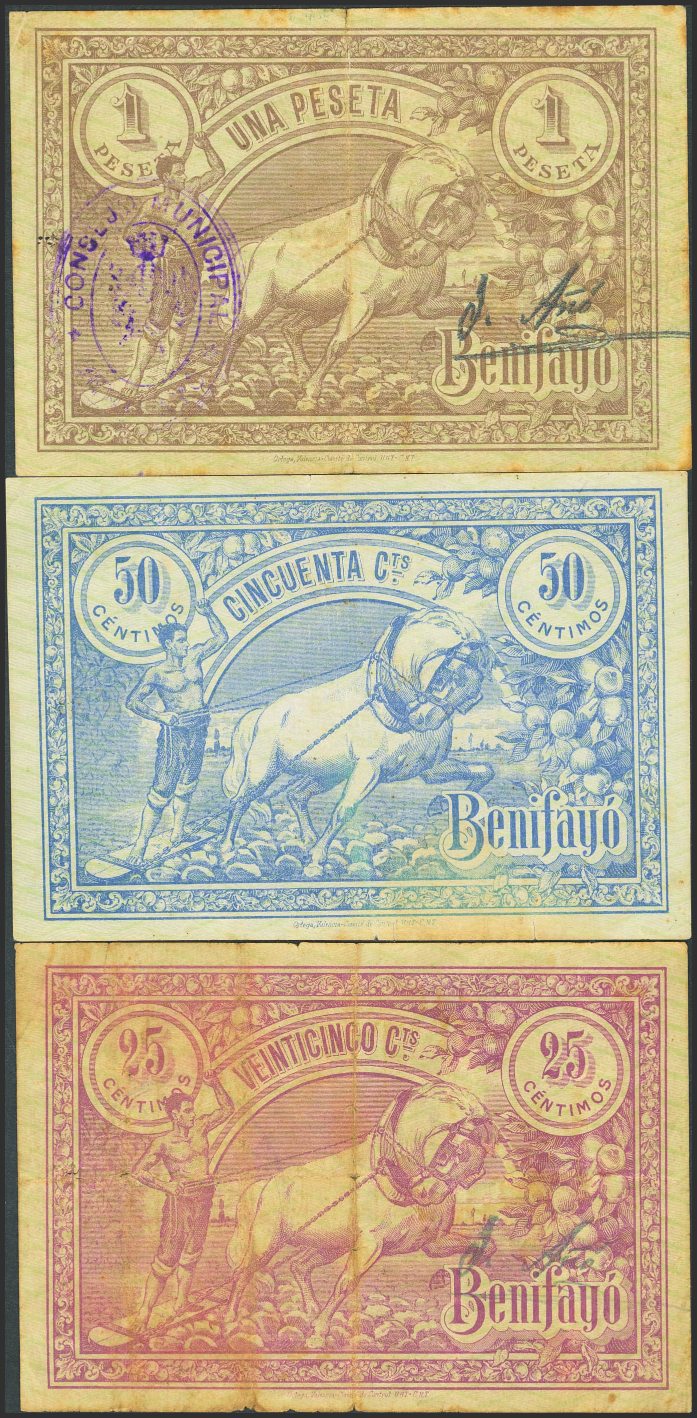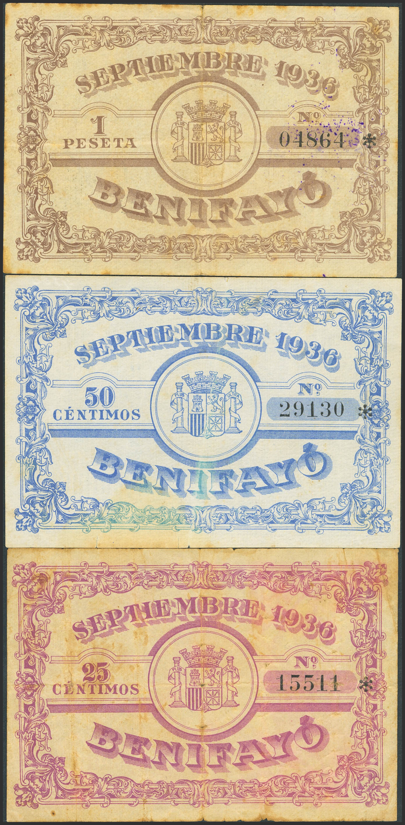 BENIFAYO (VALENCIA). 25 Céntimos, 50 Céntimos y 1 Peseta. Septiembre de 1936. (González: 1112, 1113, 1114). MBC.
