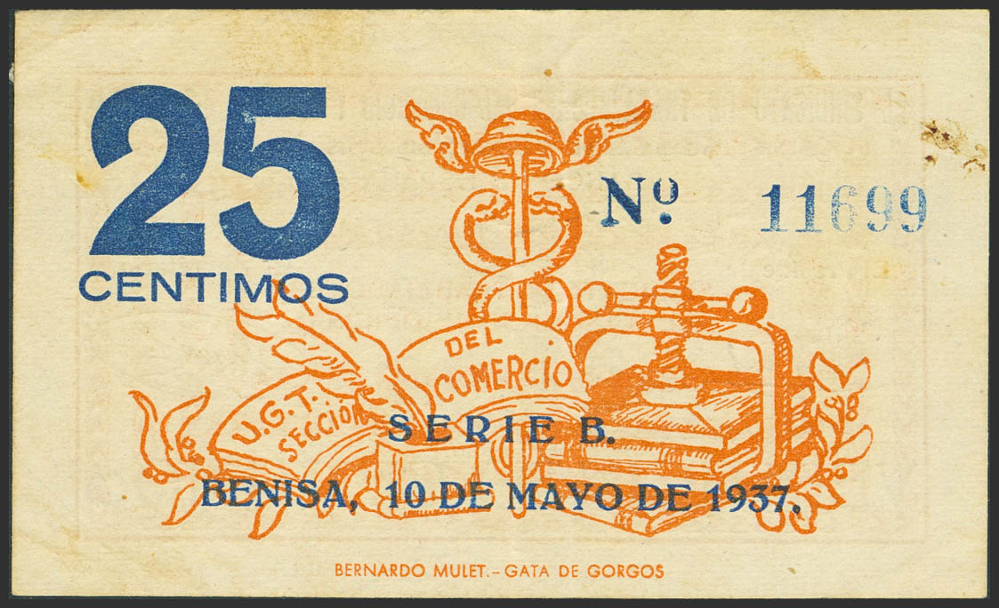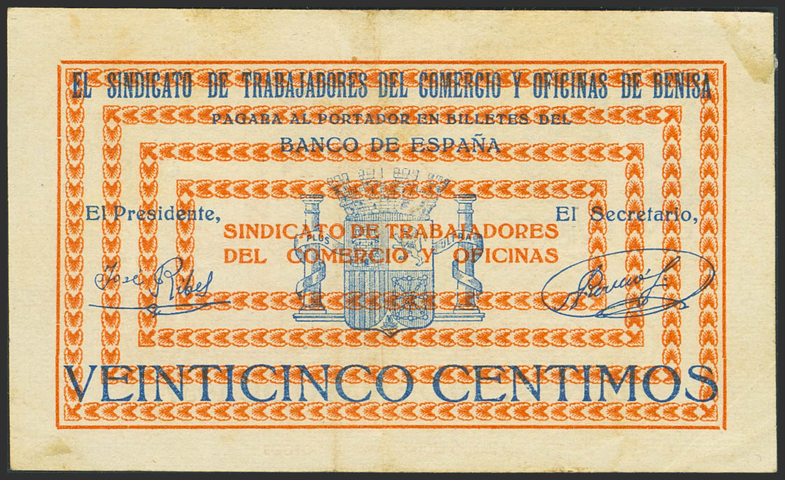 BENISA (ALICANTE). 25 Céntimos. 10 de Mayo de 1937. (González: 1156). Raro. MBC.